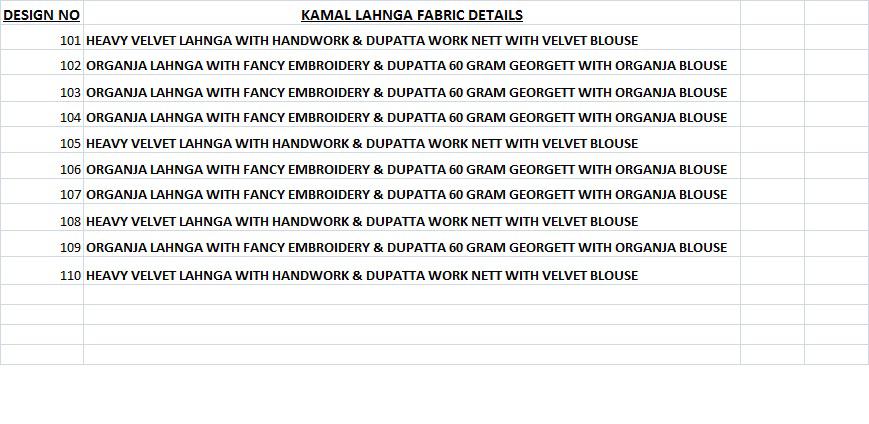 Buy Online Kamal Lehenga 1101 Series Designer Party Wear Lehenga Collection Wholesaler Surat 10 Pcs of Full Catalogue at Wholesale Price. Looking for Kamal Lehenga 1101 Series Designer Party Wear Lehenga Collection Wholesaler Surat Full Catalouge at Best Price? Buy Now Kamal Lehenga 1101 Series Designer Party Wear Lehenga Collection Wholesaler Surat at Wholesale Rate of Rs 36420 with Total 10 Pcs from authroized dealer and supplier of KAMAL Brand. Cost of Each piece is just only Rs 3642 which is very low and affordable price to resale the product in your retail store ,This is Surat based Wholesale Supplier & Dealer of KAMAL Brand. Click on Brand name to Know more about KAMAL Brand's products.Call or Whatsapp on 9898838984 for booking or enquiry