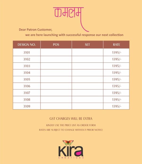 Brand _ Kira Catalog _ Kamalam Series _ 3101 to 3109 Rate list attached GST EXTRA Single available Book your order now 100+ single |