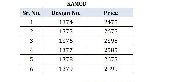Buy Online Kamod By Heart And Soul Series 1374 To 1379 Sarees Wholesale Supplier And Dealer Gujarat 6 Pcs of Full Catalogue at Wholesale Price. Looking for Kamod By Heart And Soul Series 1374 To 1379 Sarees Wholesale Supplier And Dealer Gujarat Full Catalouge at Best Price? Buy Now Kamod By Heart And Soul Series 1374 To 1379 Sarees Wholesale Supplier And Dealer Gujarat at Wholesale Rate of Rs 0 with Total 6 Pcs from authroized dealer and supplier of Heart & Soul Brand. Cost of Each piece is just only Rs 0 which is very low and affordable price to resale the product in your retail store ,This is Surat based Wholesale Supplier & Dealer of Heart & Soul Brand. Click on Brand name to Know more about Heart & Soul Brand's products.Call or Whatsapp on 9898838984 for booking or enquiry