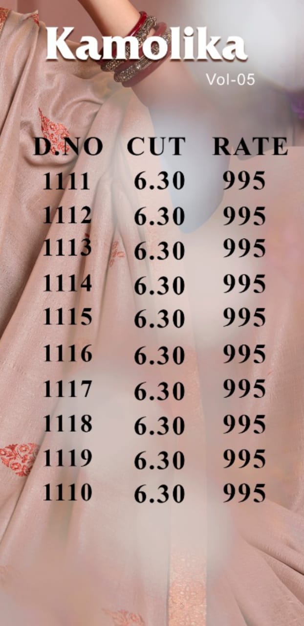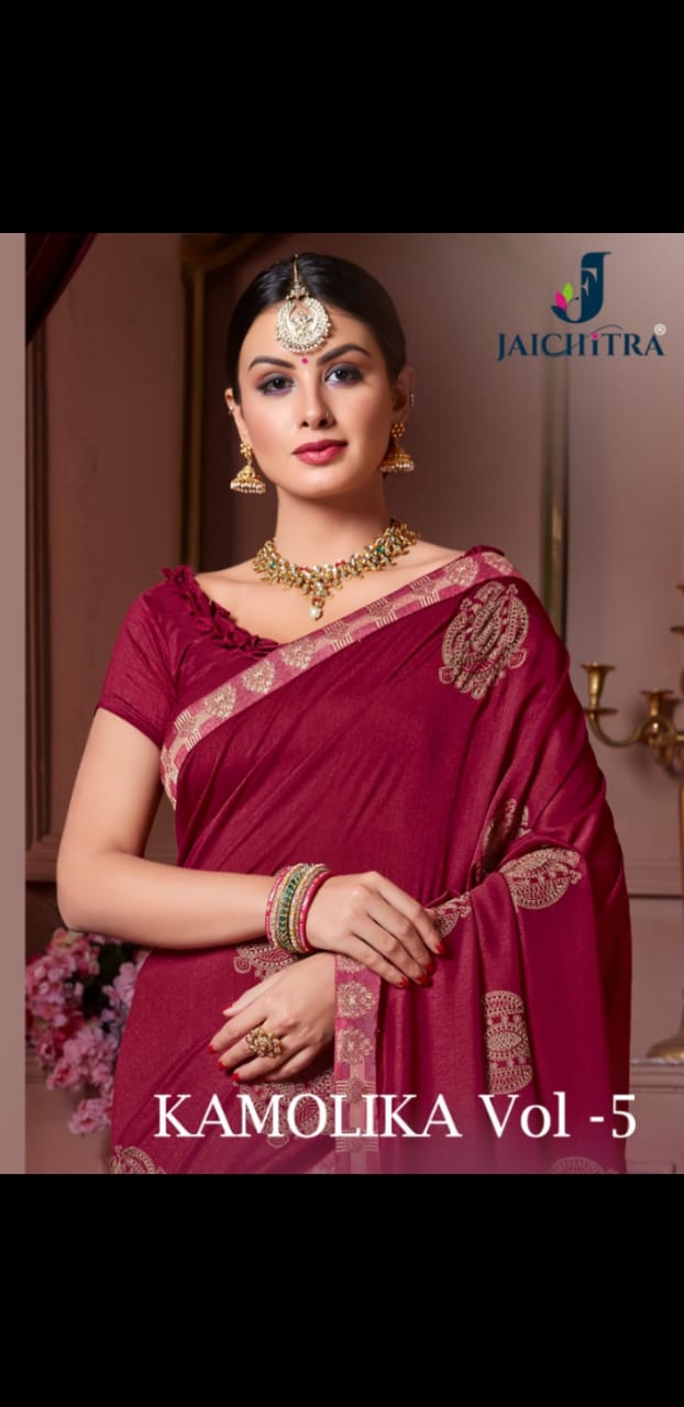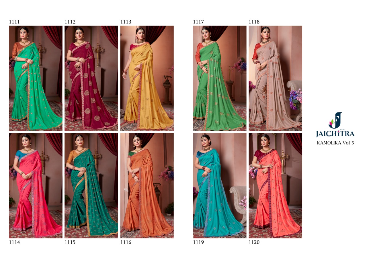 Brand - Jai Chitra . Catlog name - KAMOLIKA VOL -5. Fabric- Vichitra . Set To Set. GST 5 Percent Extra. Delivery 2 days . |