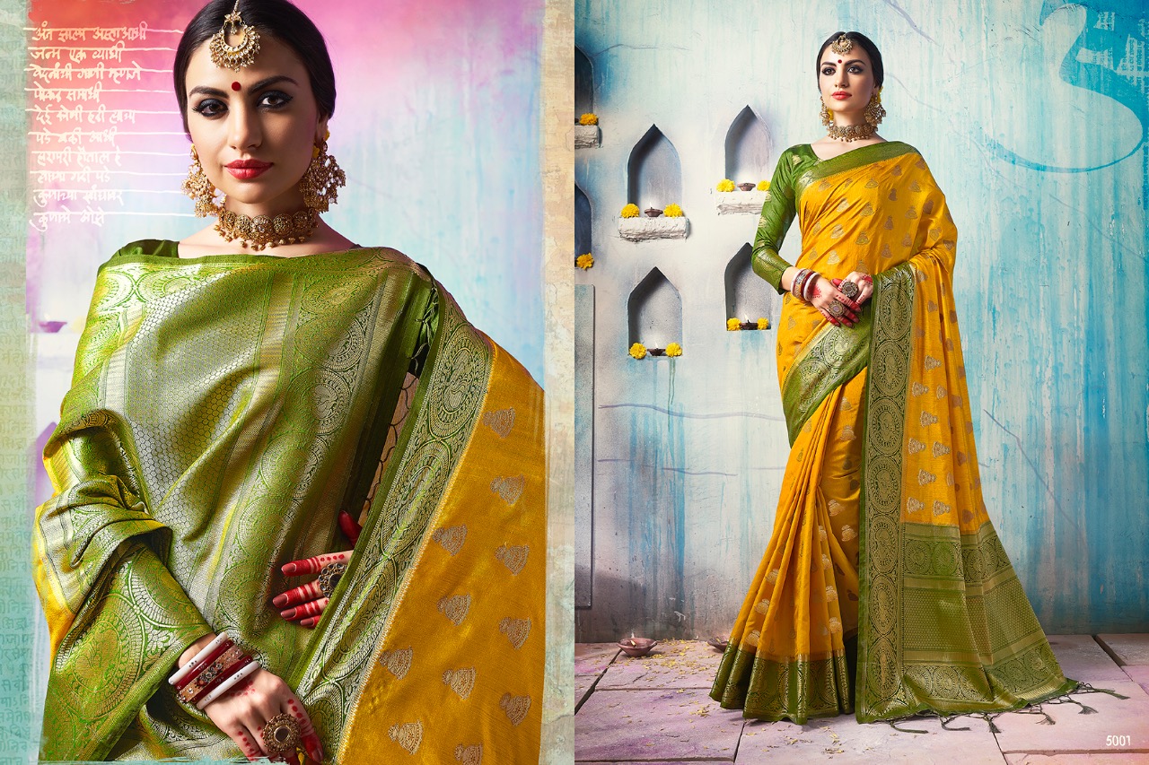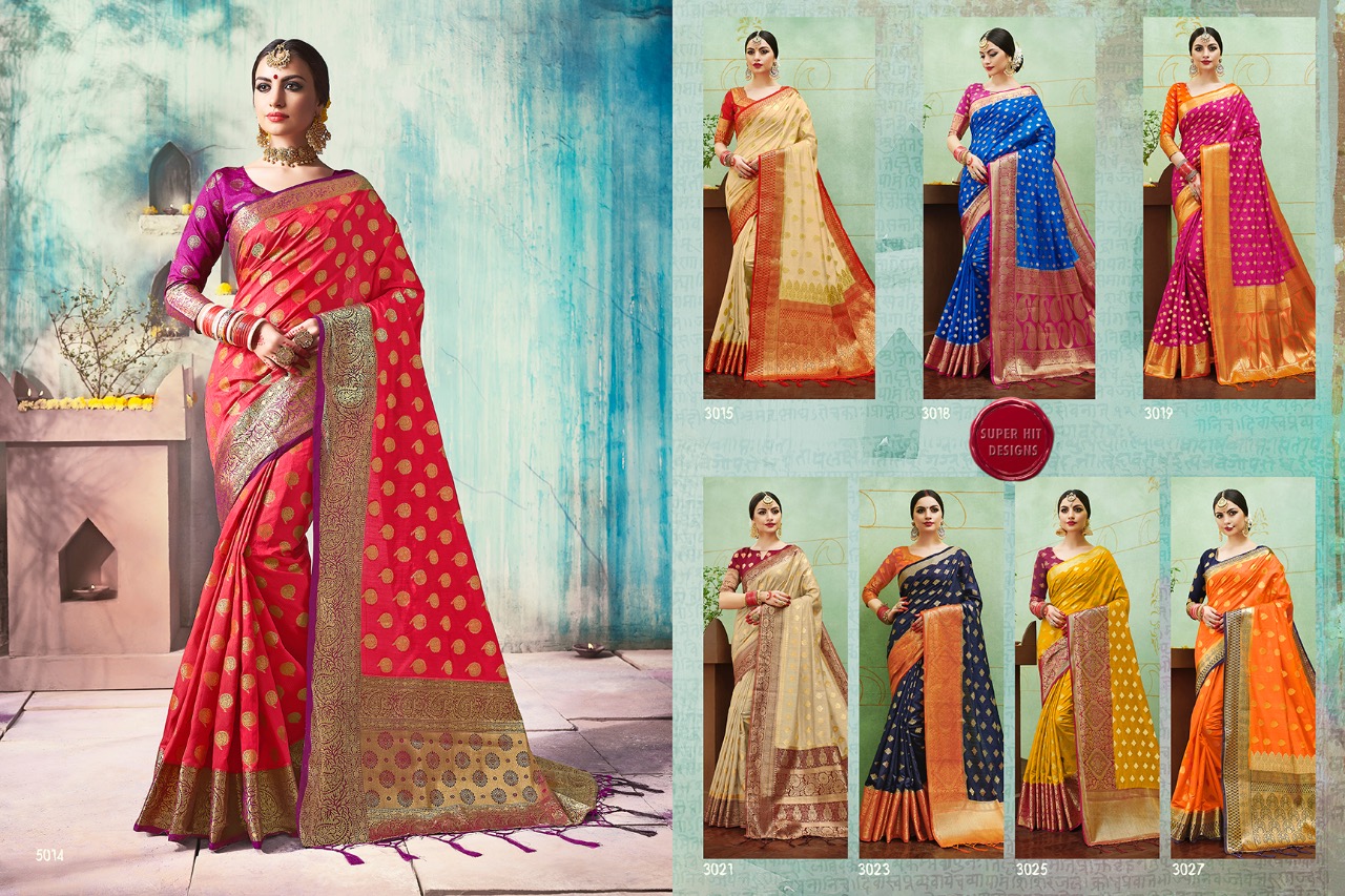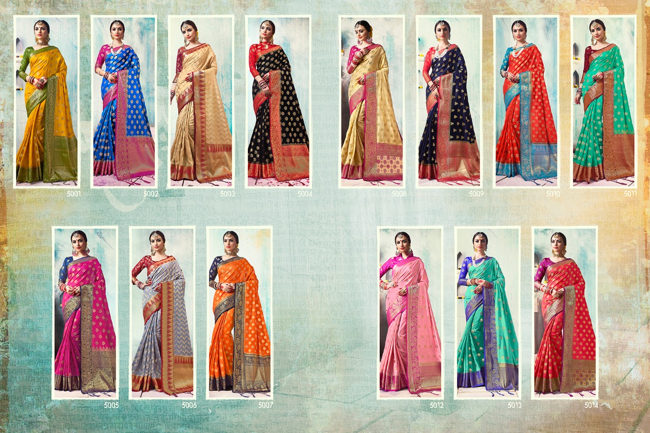 Brand - Kiaana . Type - Saree. Catlog name - Kanchi silk Fabric- Nylon silk Fabric . Series -5001 to 5014. Rate - 1661 per Pcs . GST 5 Percent Extra. Delivery date - 21-08-18. |