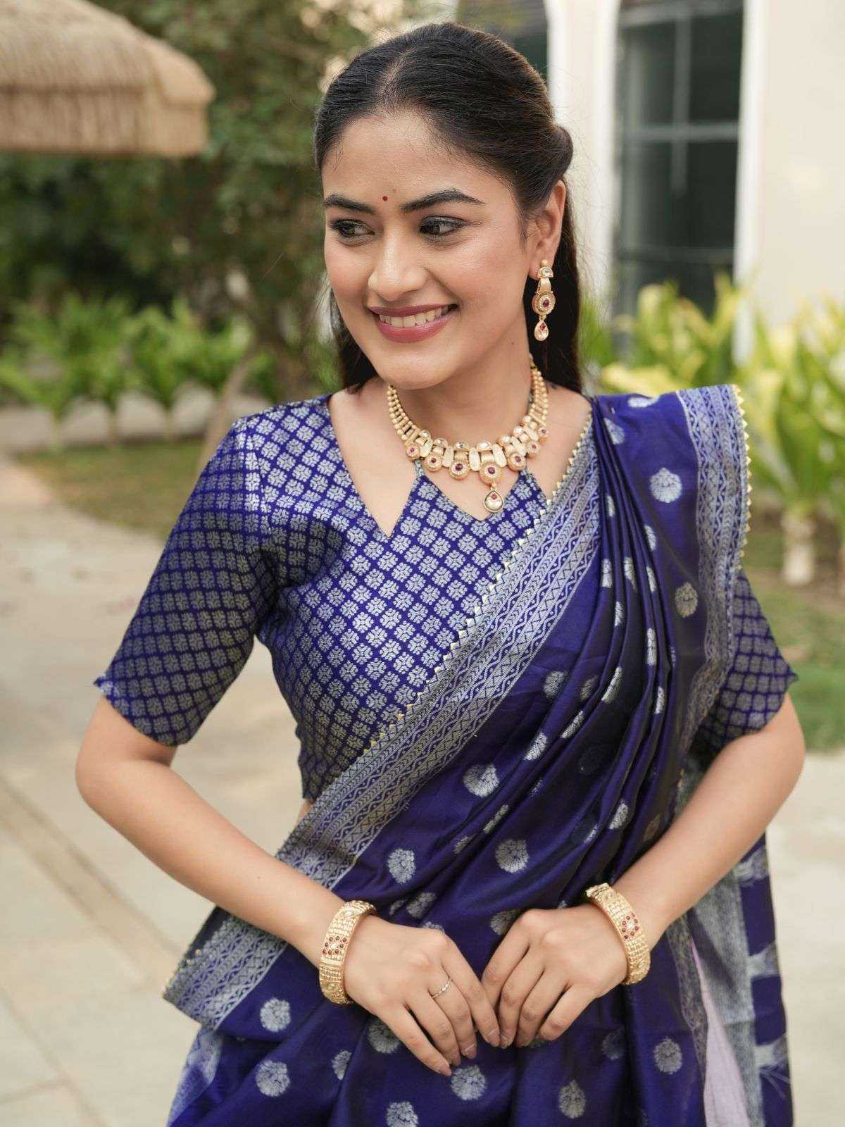 *Blouse(Unstitched)* Blouse fabric : Kanchipuram Silk Blouse Work : Silver Zari Weaving Butti Blouse Blouse Size: *0.90 Meter*