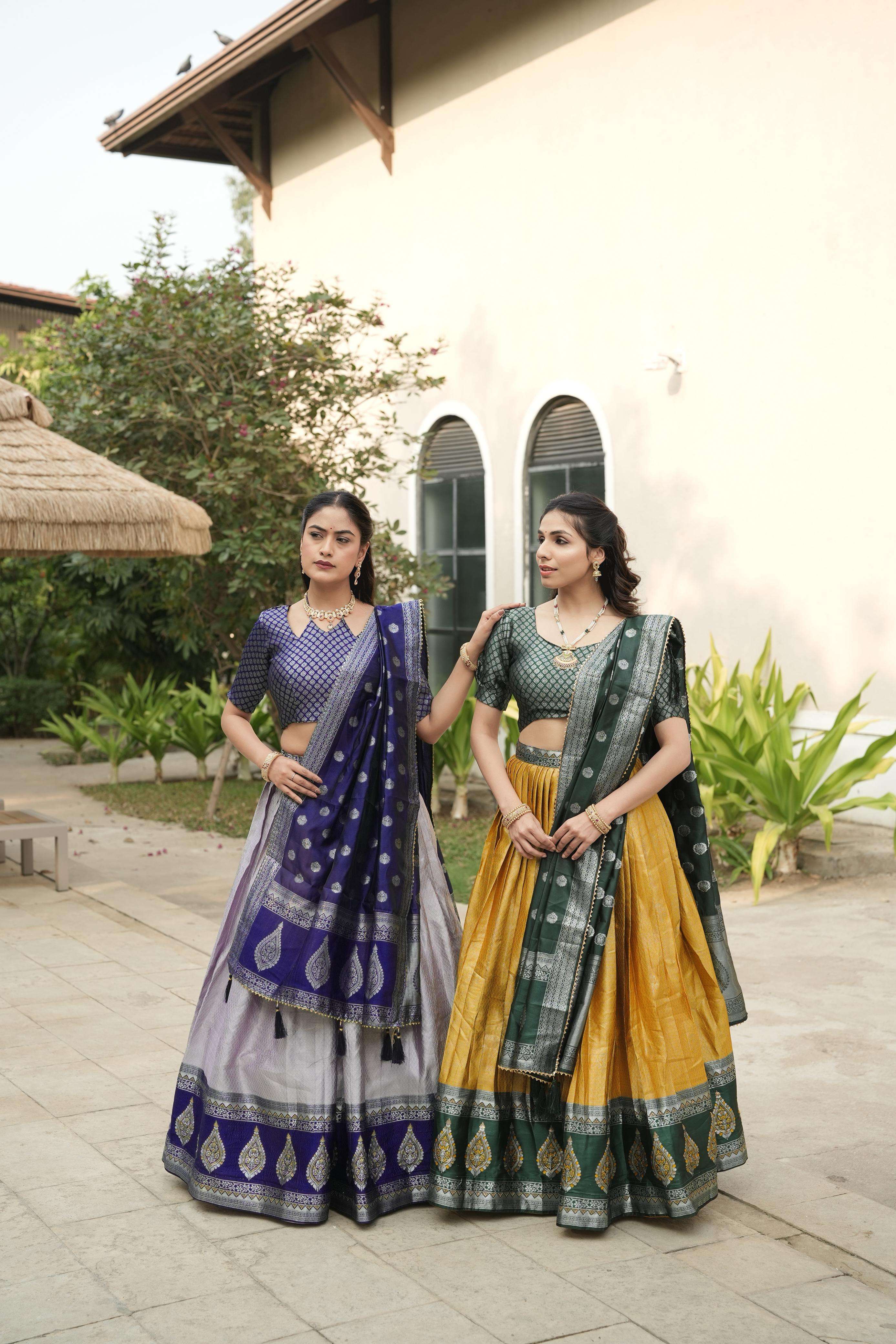 _A Majestic combination of a silk skirt in deep jewel tones and a bright, contrasting dupatta, offering a perfect silhouette for weddings and grand celebrations, A Beautiful Pair of Lehenga,Blouse n Voni to Glame up a Look_✨👜