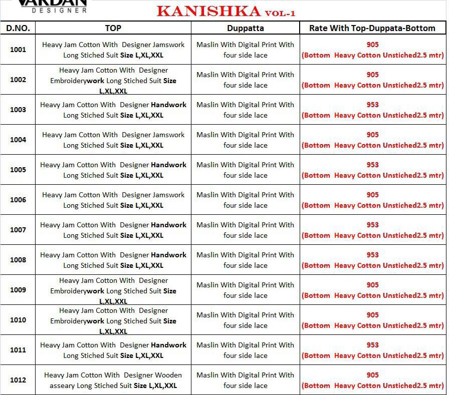 *Vardan Designer* _...the ethnic collection..._ *KANISHKA* Vol-1? Thank For Your Love? Support??. It's Inspire us?. Detail - top Â?hevay Jam Cotton With *Handwork* *Jamswork* *Embroidery* Work full stich (Size - L XL XXL) Bottom -heavy Cotton ( 2.5 mtr approx) Dupatta-heavy maslin with digital print ? *Design* -1?2? * set & Loose & Singel * GST 5 Percent Extra *#Unbeatable_price* *#Festival_collection* *?Dispatching- 3? *October* Note -very limited stock |