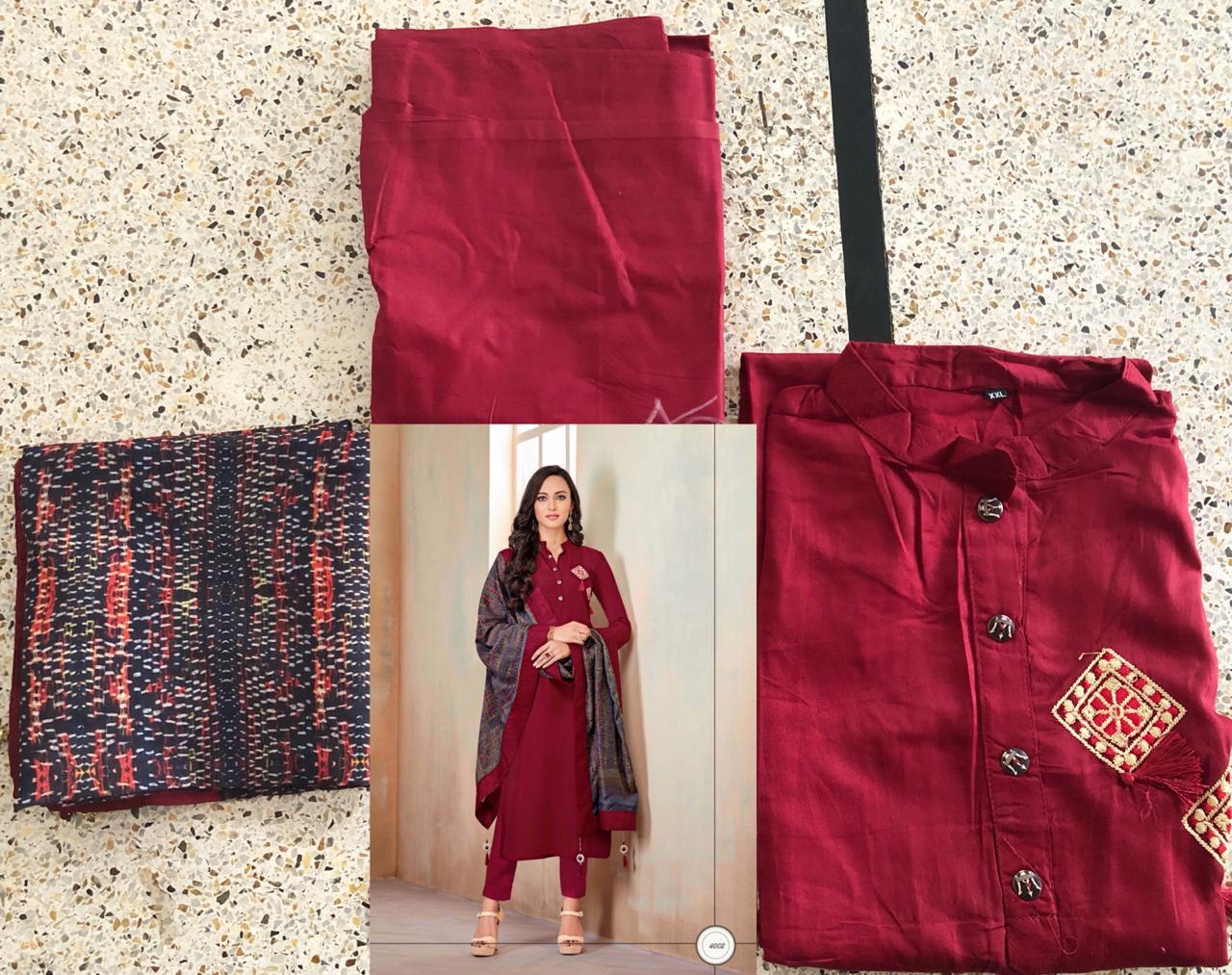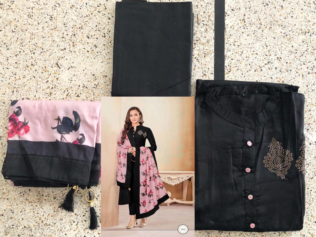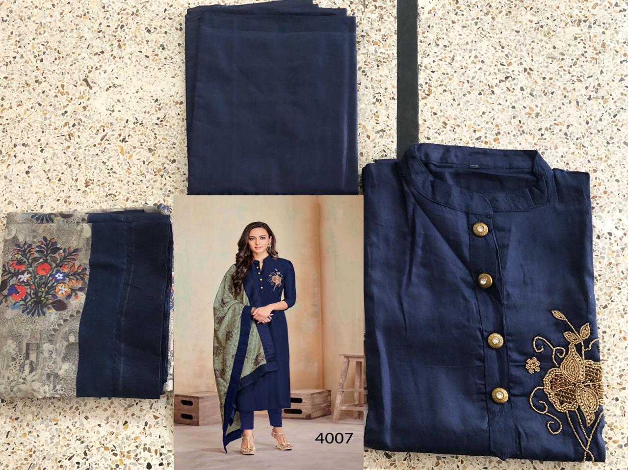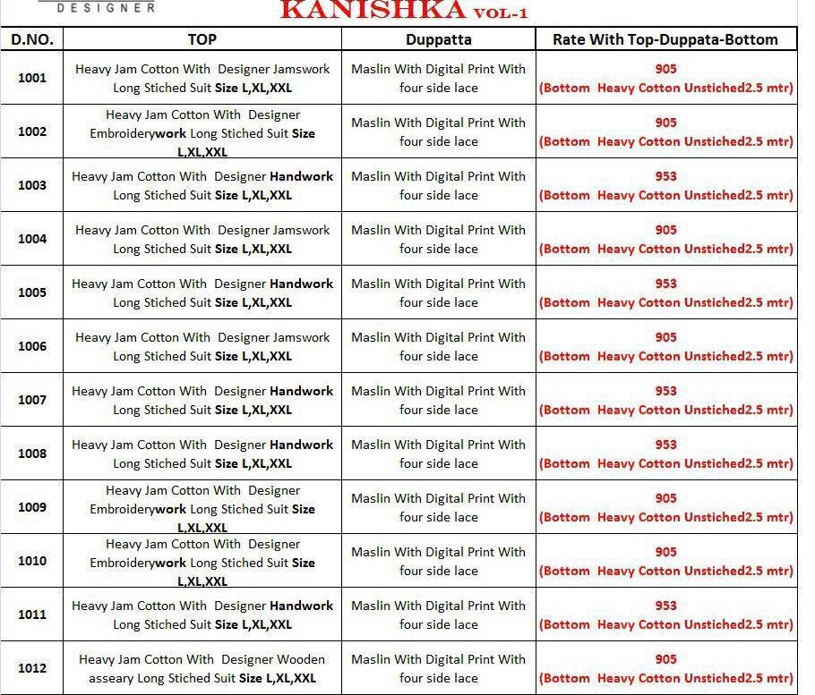 *Vardan Designer* _...the ethnic collection..._ *KANISHKA* Vol-1? Detail - top Â?hevay Jam Cotton With *Handwork* *Jamswork* *Embroidery* Work full stich (Size - L XL XXL) Bottom -heavy Cotton ( 2.5 mtr approx) Dupatta-heavy maslin with digital print ? *Design* -1?2? ?* Set & Loose & Singel * Single Extra 100 GST 5 Percent Extra. Delivery from today *#Unbeatable_price* *#Festival_collection* |