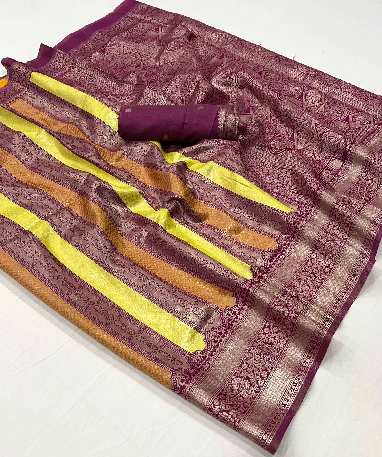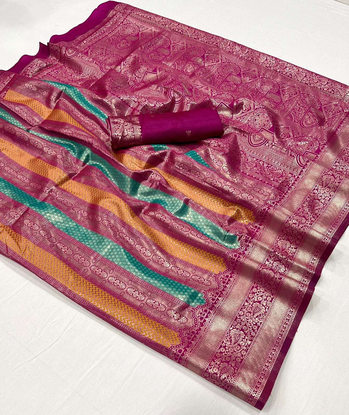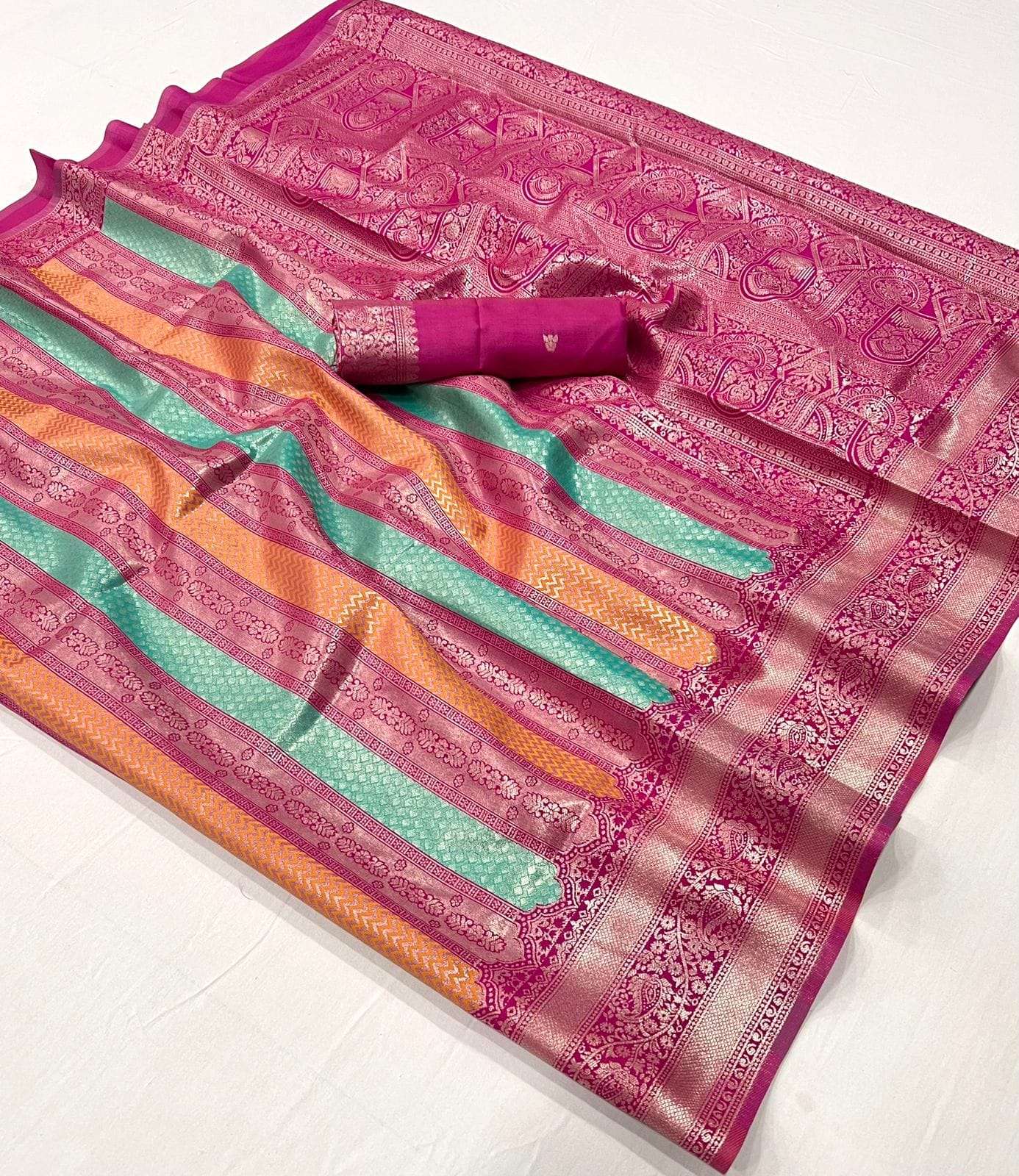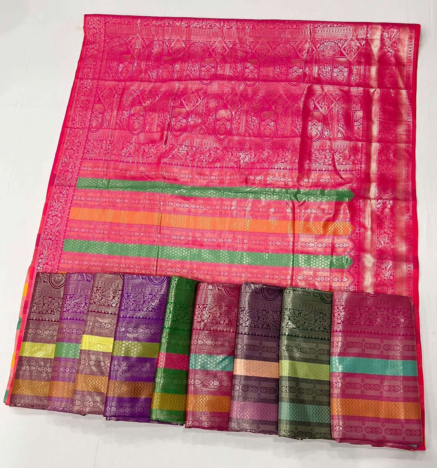 🔰 *Fabric*- *Kanjivaram silk Saree with elegant Weaving multi color lining on all over the saree Weaving border on either side Rich & Elegant Weaving Pallu as shown*