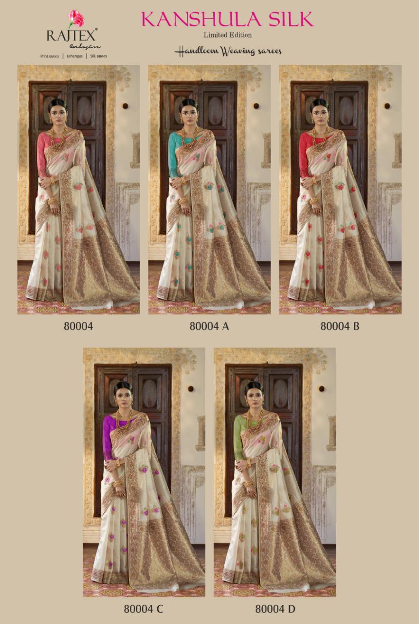 Buy Online Kanshula Silk By Raj Tex Series 80004 Handloom Weaving Sarees Wholesale Supplier And Dealer India 5 Pcs of Full Catalogue at Wholesale Price. Looking for Kanshula Silk By Raj Tex Series 80004 Handloom Weaving Sarees Wholesale Supplier And Dealer India Full Catalouge at Best Price? Buy Now Kanshula Silk By Raj Tex Series 80004 Handloom Weaving Sarees Wholesale Supplier And Dealer India at Wholesale Rate of Rs 6800 with Total 5 Pcs from authroized dealer and supplier of RAJTEX Brand. Cost of Each piece is just only Rs 1360 which is very low and affordable price to resale the product in your retail store ,This is Surat based Wholesale Supplier & Dealer of RAJTEX Brand. Click on Brand name to Know more about RAJTEX Brand's products.Call or Whatsapp on 9898838984 for booking or enquiry