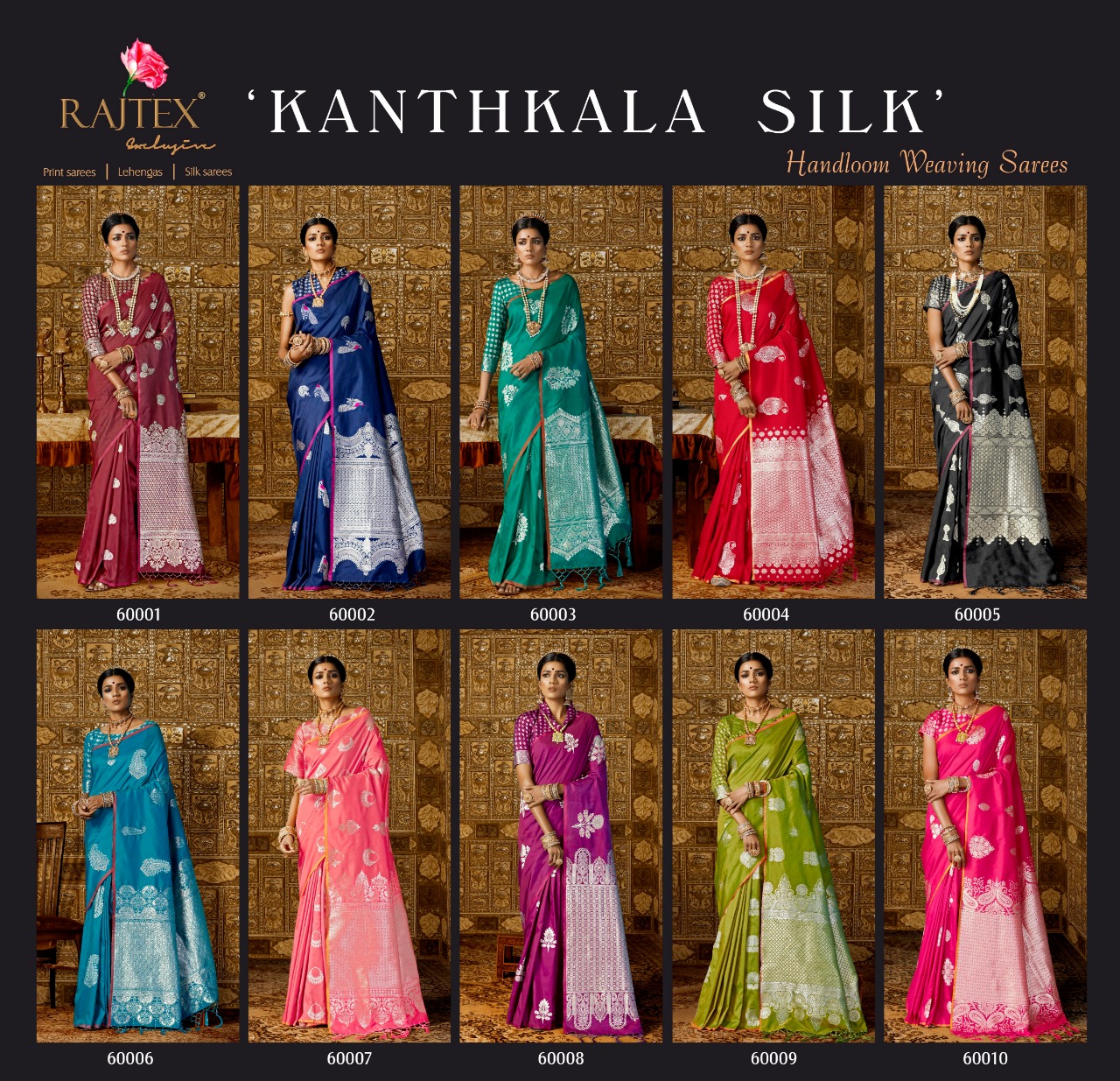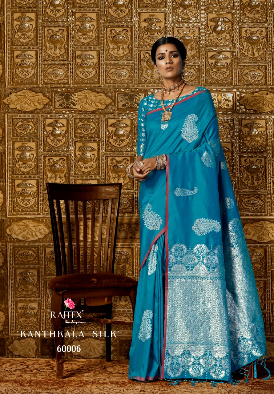 Buy Online Kanthkala Silk By Rajtex 60001 Series Designer Silk Saree Collection Wholesaler And Supplier Surat 10 Pcs of Full Catalogue at Wholesale Price. Looking for Kanthkala Silk By Rajtex 60001 Series Designer Silk Saree Collection Wholesaler And Supplier Surat Full Catalouge at Best Price? Buy Now Kanthkala Silk By Rajtex 60001 Series Designer Silk Saree Collection Wholesaler And Supplier Surat at Wholesale Rate of Rs 10950 with Total 10 Pcs from authroized dealer and supplier of RAJTEX Brand. Cost of Each piece is just only Rs 1095 which is very low and affordable price to resale the product in your retail store ,This is Surat based Wholesale Supplier & Dealer of RAJTEX Brand. Click on Brand name to Know more about RAJTEX Brand's products.Call or Whatsapp on 9898838984 for booking or enquiry