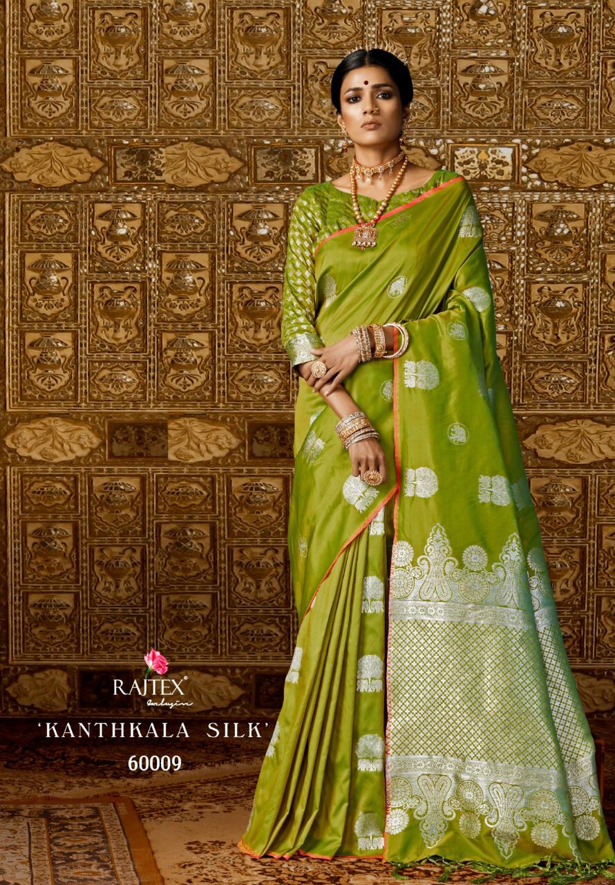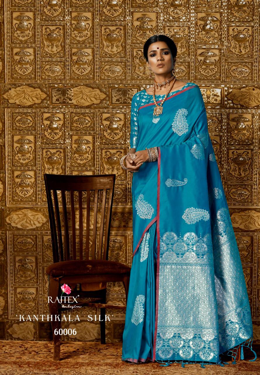 Buy Online Kanthkala Silk By Rajtex 60001 Series Fancy Designer Weaving Silk Saree Collection Wholesale Dealer Surat 10 Pcs of Full Catalogue at Wholesale Price. Looking for Kanthkala Silk By Rajtex 60001 Series Fancy Designer Weaving Silk Saree Collection Wholesale Dealer Surat Full Catalouge at Best Price? Buy Now Kanthkala Silk By Rajtex 60001 Series Fancy Designer Weaving Silk Saree Collection Wholesale Dealer Surat at Wholesale Rate of Rs 10950 with Total 10 Pcs from authroized dealer and supplier of RAJTEX Brand. Cost of Each piece is just only Rs 1095 which is very low and affordable price to resale the product in your retail store ,This is Surat based Wholesale Supplier & Dealer of RAJTEX Brand. Click on Brand name to Know more about RAJTEX Brand's products.Call or Whatsapp on 9898838984 for booking or enquiry