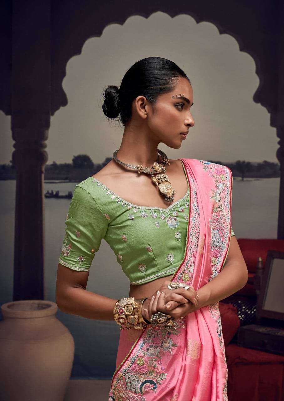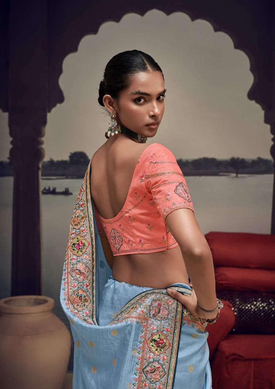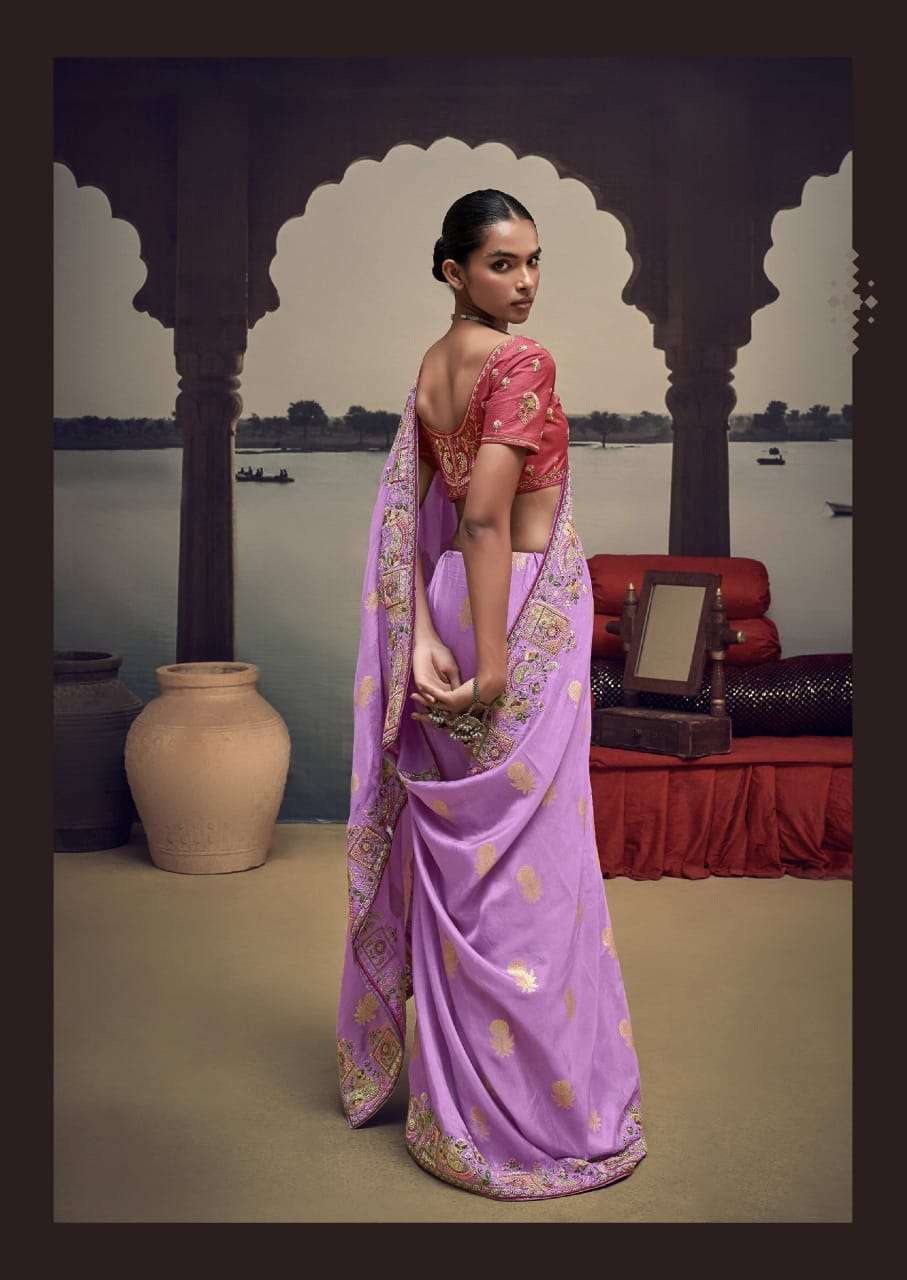 ➡️Catalog - *Karagiri* ➡️Fabric - *Pure Based Fancy, Sattin & Dola Fabric* *With Heavy Handworked border & Contrast Designer Blouse* ➡️Rate - *3595+5%*