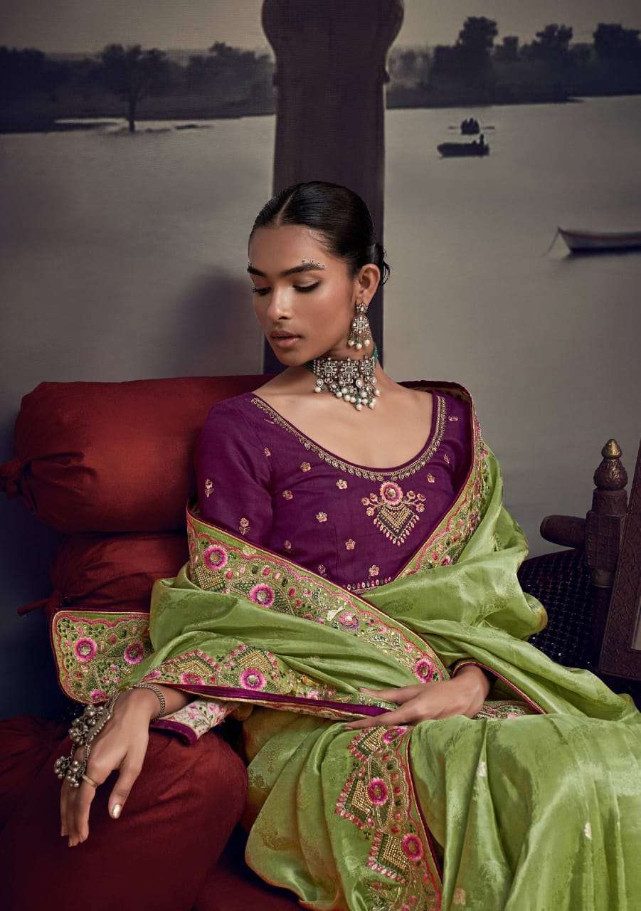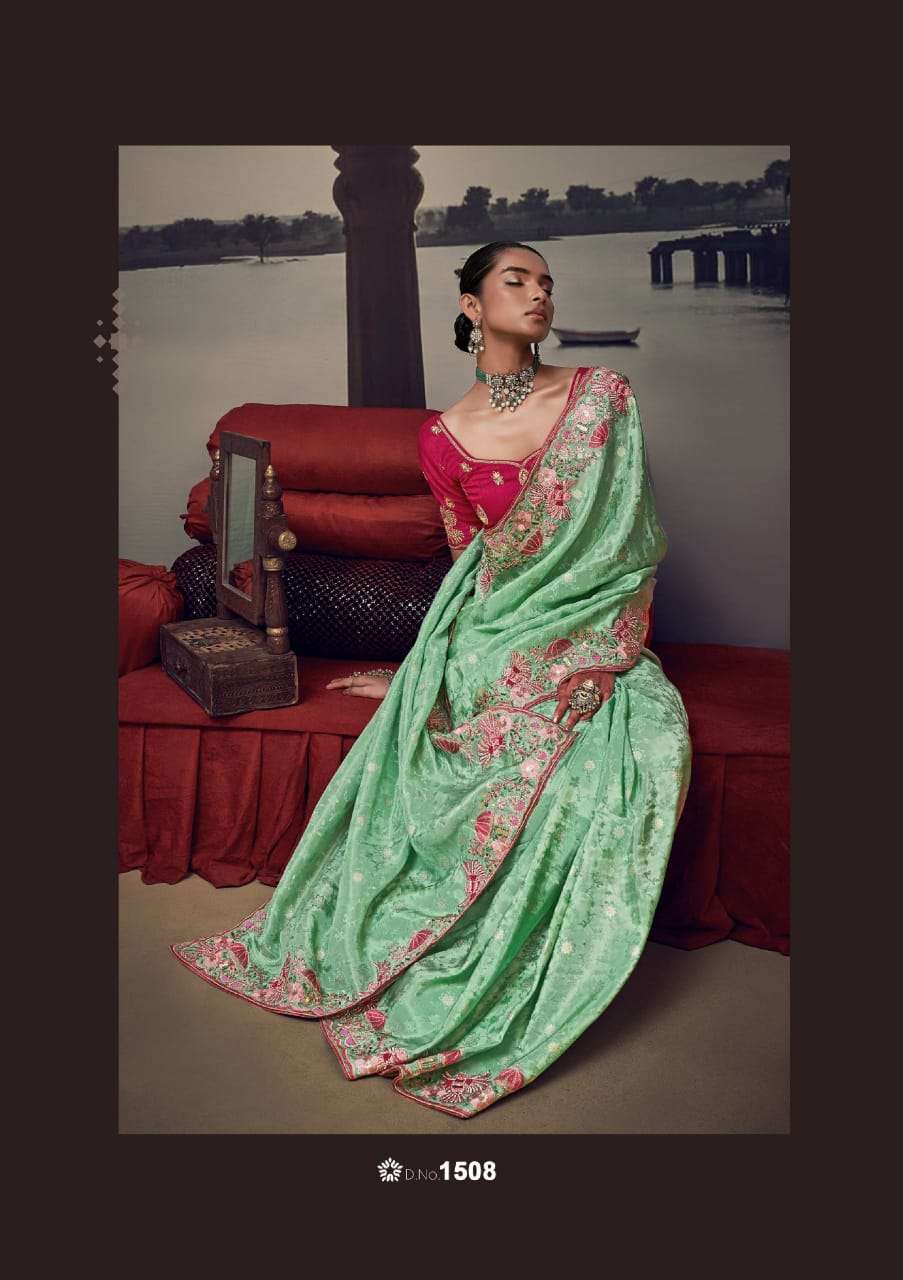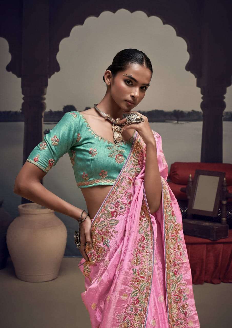 ➡️Catalog - *Karagiri* ➡️Fabric - *Pure Based Fancy, Sattin & Dola Fabric* *With Heavy Handworked border & Contrast Designer Blouse* ➡️Rate - *3595+5%*