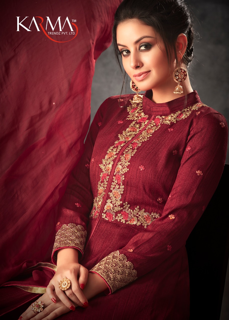 *"Karma"*_ BRAND CREATED BY YOU..... *Â?HEAVY ROW SILK EMBROIDERY TOP WITH DUPPATA COLLECTION"* *12060 SERIES..* It is a Brand Synonymous with Sophistication and Style it is for the Women of today,who prefers to make a Statement whenever she step out. So that's the time we launched our most demanded dupatta concept Designer collection of 6 designs....... Fabric Details:- ? Top : - Row silk embroidered with diamond work. Inner :- Santon Bottam -Santon ??Dup. : *PURE CHIFFON* *RATE LIST & FABRIC DESCRIPTION ATTACHED..* Have a look to this awesome catalogue & book your orders...and thanks for ur support hope u always with us. Always with you...... Team:- *Karma* |