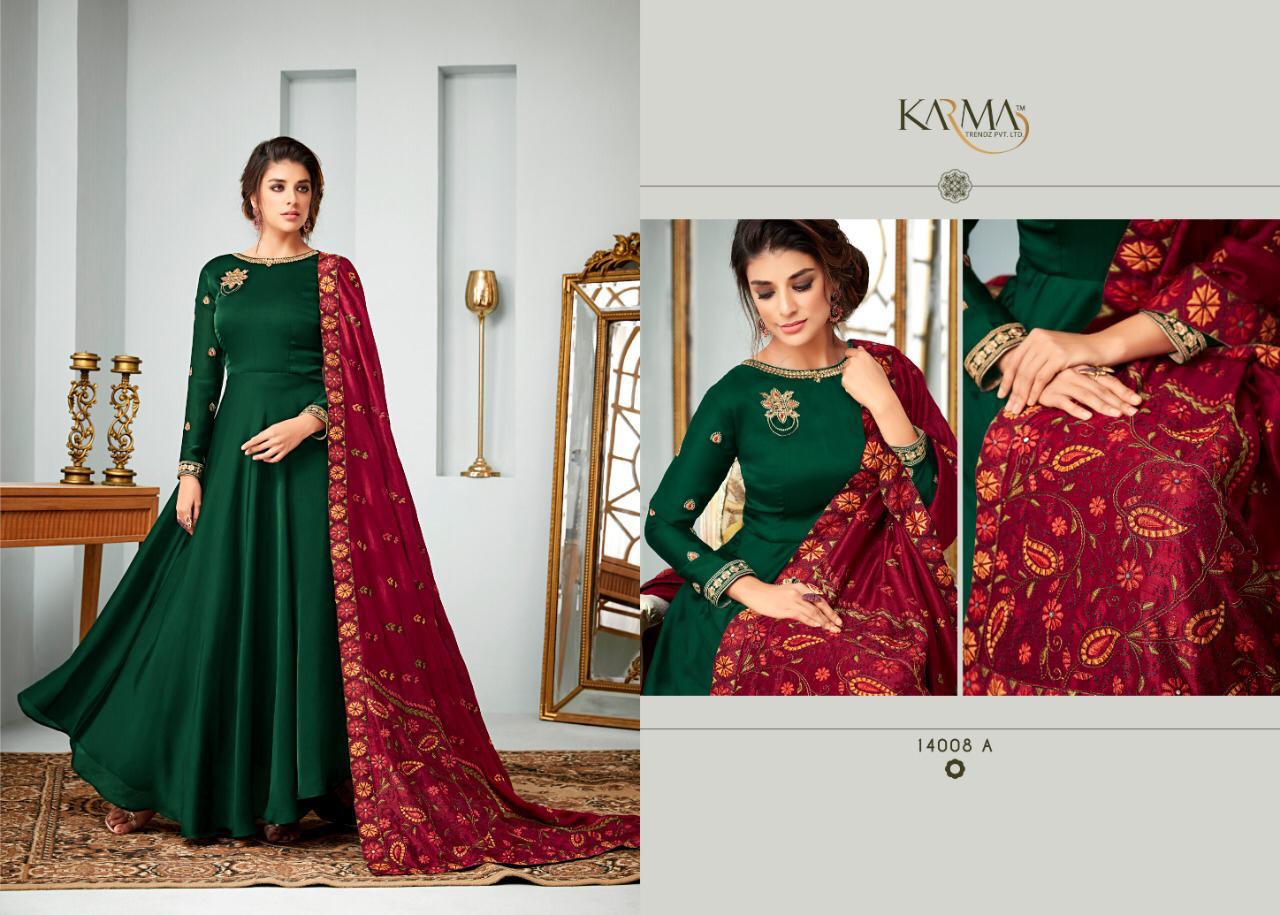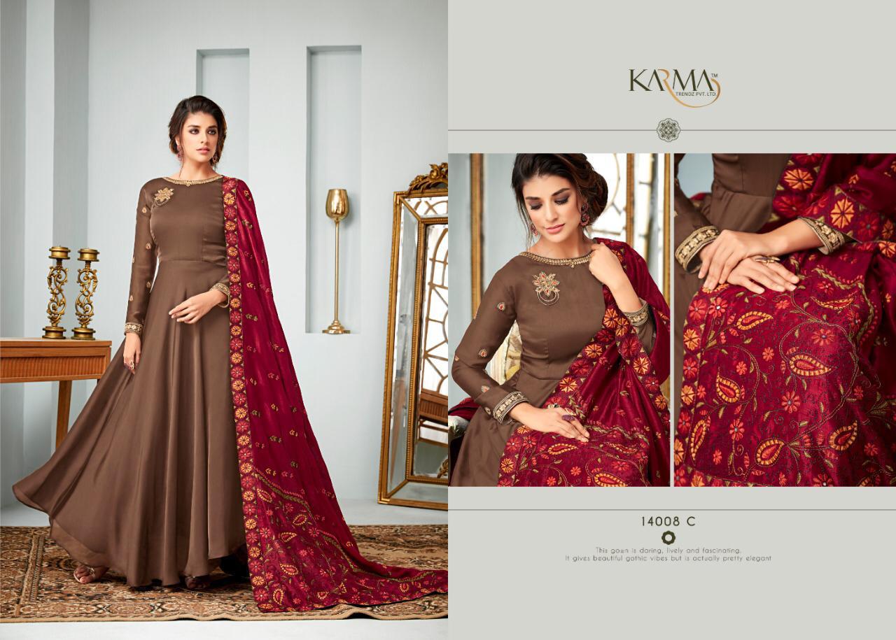 Buy Online Karma 14008 Colours Series Fancy Deaigner Satin Georgette Gown Suit Collection Wholeaaler Surat 5 Pcs of Full Catalogue at Wholesale Price. Looking for Karma 14008 Colours Series Fancy Deaigner Satin Georgette Gown Suit Collection Wholeaaler Surat Full Catalouge at Best Price? Buy Now Karma 14008 Colours Series Fancy Deaigner Satin Georgette Gown Suit Collection Wholeaaler Surat at Wholesale Rate of Rs 11250 with Total 5 Pcs from authroized dealer and supplier of KARMA Brand. Cost of Each piece is just only Rs 2250 which is very low and affordable price to resale the product in your retail store ,This is Surat based Wholesale Supplier & Dealer of KARMA Brand. Click on Brand name to Know more about KARMA Brand's products.Call or Whatsapp on 9898838984 for booking or enquiry
