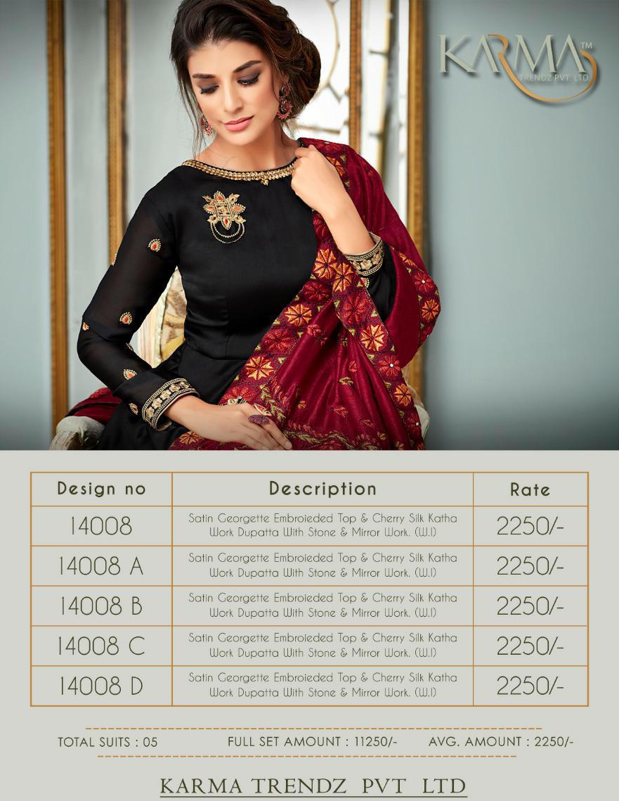 Karma New Colours . 14008 Colours . GST 5 Percent Extra. Delivery after 7 -8 days . Book your order now Single 2350+gst Full set 2250+gst pp discount available on full set |