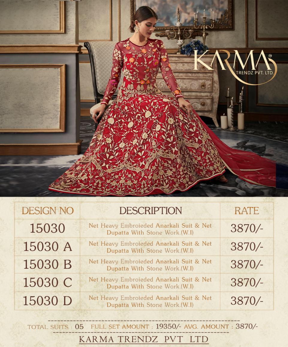 *"KARMA"*_ BRAND CREATED BY YOU..... ??????? Super hit design colour plus Dn.1?5?0?3?0? ??EID SPECIAL?? *Â?NET HEAVY EMBROIDERED ANARKALI TOP AND NET DUPATTA WITH STONE WORK COLLECTION"* It is a Brand Synonymous with Sophistication and Style it is for the Women of today,who prefers to make a Statement whenever she step out. So that's the time we launched our most demanded concept *Designer Heavy Net Embroidered Anarkali style colour plus* collection of 5 colours....... ?Quality Fabrics... *No.1* ?Best Designs.... ?Latest Colours.... ?Rich Combinations.... Fabric Details:- ? Top : - Net heavy embroidered top and additional diamond work. Inner :- Raw silk Bottam - Raw silk ??Dup. : -Net with diamond work Have a look to this awesome catalogue & book your orders...and thanks for ur support hope u always with us. Always with you...... Team:- karma....,,,, * set & Loose * Single Extra 100 on company price list GST 5 Percent Extra. Delivery -27-05-19 |