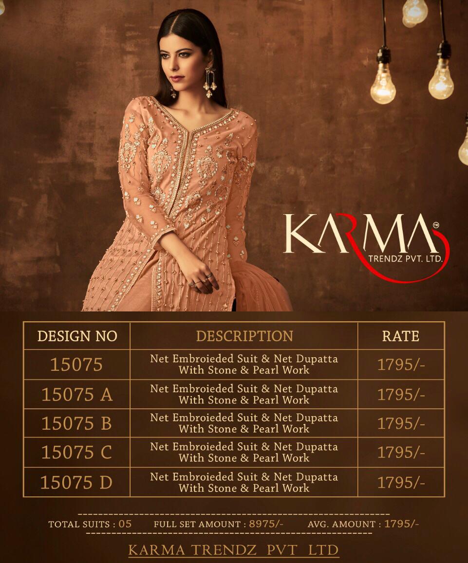 Buy Online Karma 15075 Colours Designer Party Wear Suits Wholesale Supplier Gujarat 5 Pcs of Full Catalogue at Wholesale Price. Looking for Karma 15075 Colours Designer Party Wear Suits Wholesale Supplier Gujarat Full Catalouge at Best Price? Buy Now Karma 15075 Colours Designer Party Wear Suits Wholesale Supplier Gujarat at Wholesale Rate of Rs 8975 with Total 5 Pcs from authroized dealer and supplier of KARMA Brand. Cost of Each piece is just only Rs 1795 which is very low and affordable price to resale the product in your retail store ,This is Surat based Wholesale Supplier & Dealer of KARMA Brand. Click on Brand name to Know more about KARMA Brand's products.Call or Whatsapp on 9898838984 for booking or enquiry