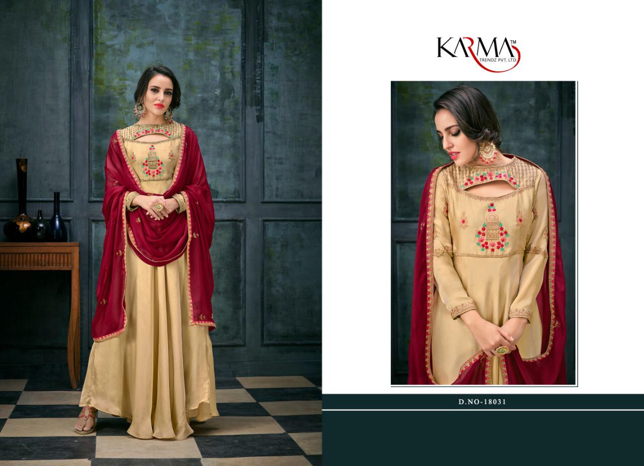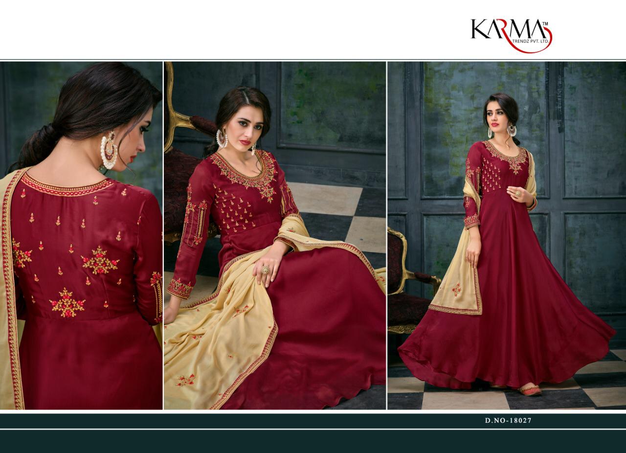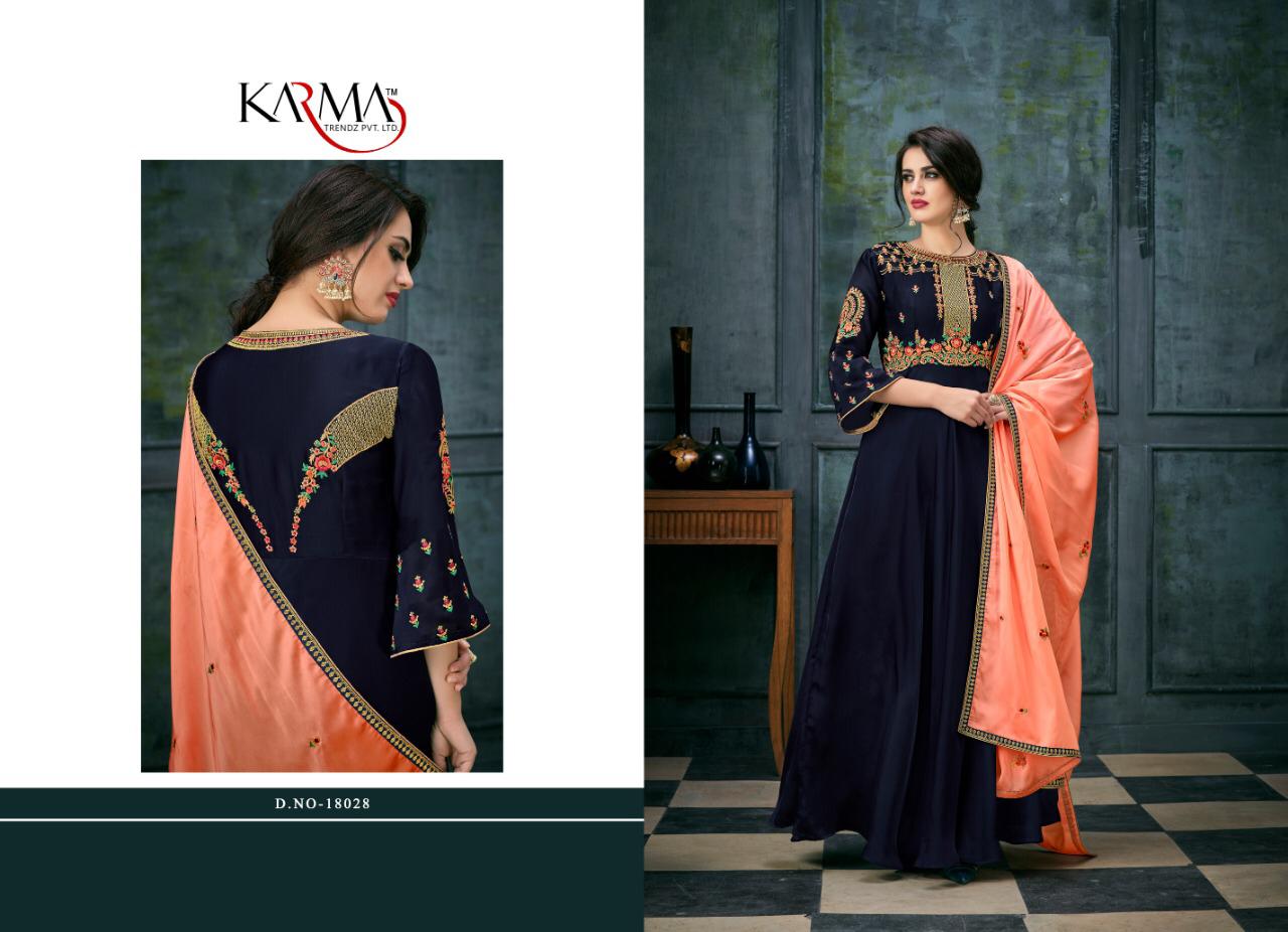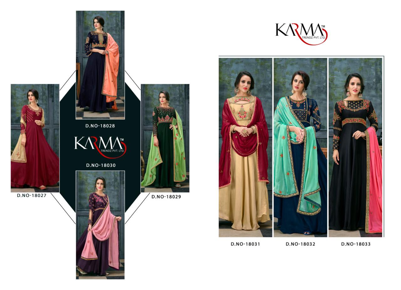 Buy Online Karma 18027 Series Satin Georgette Embroidered Designer Party Wear Gowns Wholesale Supplier India 7 Pcs of Full Catalogue at Wholesale Price. Looking for Karma 18027 Series Satin Georgette Embroidered Designer Party Wear Gowns Wholesale Supplier India Full Catalouge at Best Price? Buy Now Karma 18027 Series Satin Georgette Embroidered Designer Party Wear Gowns Wholesale Supplier India at Wholesale Rate of Rs 11165 with Total 7 Pcs from authroized dealer and supplier of KARMA Brand. Cost of Each piece is just only Rs 1595 which is very low and affordable price to resale the product in your retail store ,This is Surat based Wholesale Supplier & Dealer of KARMA Brand. Click on Brand name to Know more about KARMA Brand's products.Call or Whatsapp on 9898838984 for booking or enquiry