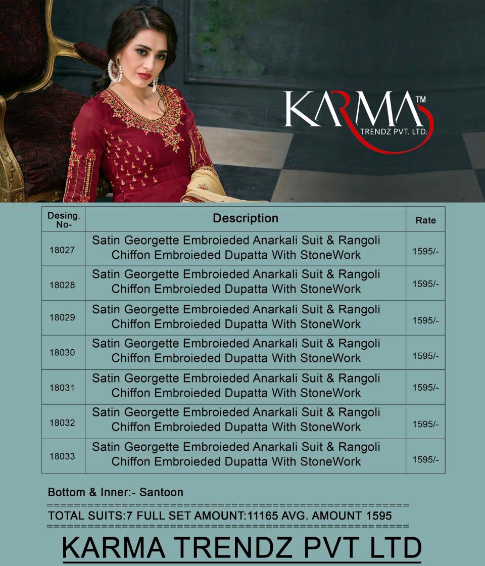 *"Karma"*_ BRAND CREATED BY YOU..... *?18027 SERIES..?* *Â?SATIN GEORGET EMBROIDERY TOP WITH RANGOLI EMBROIDERED WORK DUPPATA COLLECTION"* Fabric Details:- ? Top : - Satin Georgette embroidered with Stone work. Inner :- Santon Bottam -santon ??Dup. : *RANGOLI EMBROIDERED WITH STONE WORK* *DISPATCH DATE:-15 APRIL* Single @ extra ? on company price+gst pre-bookng started Have a look to this awesome catalogue & book your orders...and thanks for ur support hope u always with us. Always with you...... Team:- *Karma* Set & Loose GST 5 Percent Extra. Delivery 6-7 days . |