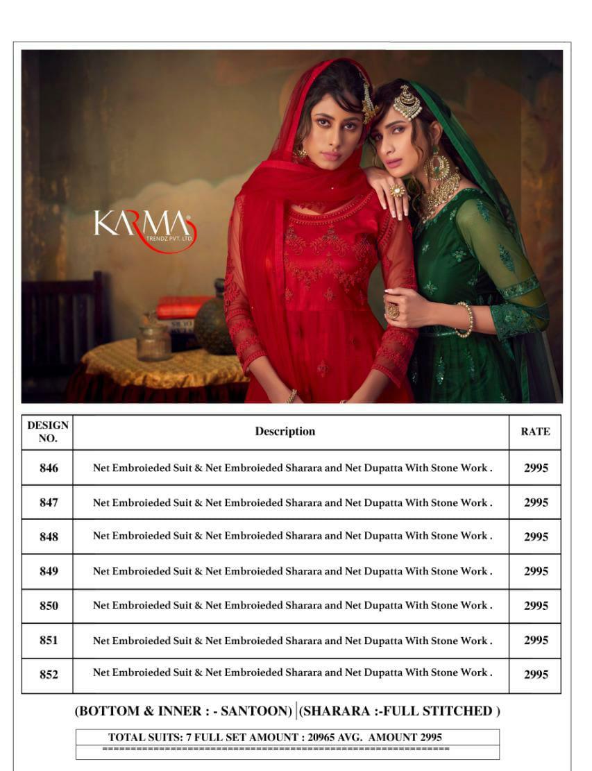 Buy Online Karma 846 Series Designer Party Wear Suits Wholesale Supplier Gujarat 7 Pcs of Full Catalogue at Wholesale Price. Looking for Karma 846 Series Designer Party Wear Suits Wholesale Supplier Gujarat Full Catalouge at Best Price? Buy Now Karma 846 Series Designer Party Wear Suits Wholesale Supplier Gujarat at Wholesale Rate of Rs 20965 with Total 7 Pcs from authroized dealer and supplier of KARMA Brand. Cost of Each piece is just only Rs 2995 which is very low and affordable price to resale the product in your retail store ,This is Surat based Wholesale Supplier & Dealer of KARMA Brand. Click on Brand name to Know more about KARMA Brand's products.Call or Whatsapp on 9898838984 for booking or enquiry