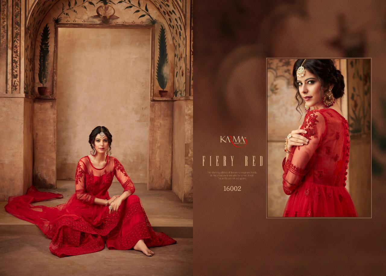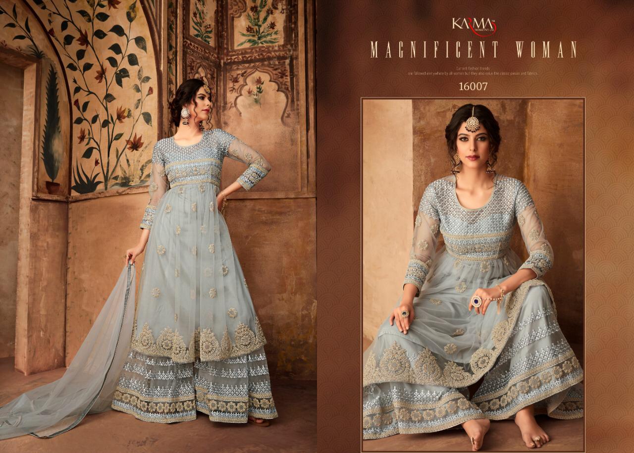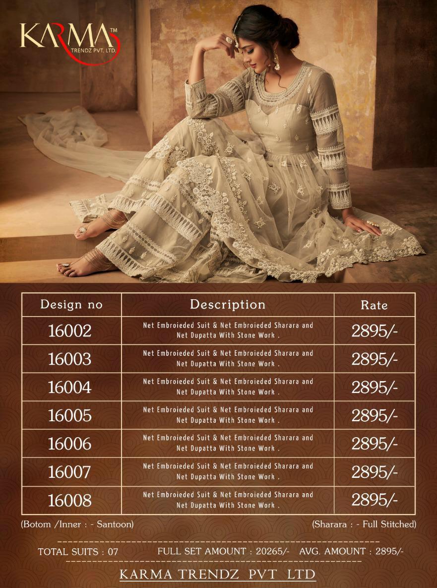 Buy Online Karma Eid Special 16002 Series Heavy Embroidered Designer Party Wear Suits Wholesale Supplier And Dealer Surat 7 Pcs of Full Catalogue at Wholesale Price. Looking for Karma Eid Special 16002 Series Heavy Embroidered Designer Party Wear Suits Wholesale Supplier And Dealer Surat Full Catalouge at Best Price? Buy Now Karma Eid Special 16002 Series Heavy Embroidered Designer Party Wear Suits Wholesale Supplier And Dealer Surat at Wholesale Rate of Rs 20265 with Total 7 Pcs from authroized dealer and supplier of KARMA Brand. Cost of Each piece is just only Rs 2895 which is very low and affordable price to resale the product in your retail store ,This is Surat based Wholesale Supplier & Dealer of KARMA Brand. Click on Brand name to Know more about KARMA Brand's products.Call or Whatsapp on 9898838984 for booking or enquiry