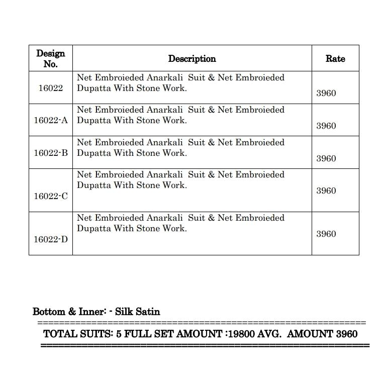 *"KARMA"*_ BRAND CREATED BY YOU..... *?Dn.1?6?0?2?2? Colour plus?* *Â?NET HEAVY EMBROIDERED ANARKALI TOP AND NET EMBROIDERED DUPATTA WITH STONE WORK COLLECTION"* It is a Brand Synonymous with Sophistication and Style it is for the Women of today,who prefers to make a Statement whenever she step out. So that's the time we launched our most demanded concept *Designer Heavy Net Embroidered Anarkali style* collection of 4 designs....... ?Quality Fabrics... *No.1* ?Best Designs.... ?Latest Colours.... ?Rich Combinations.... Fabric Details:- ? Top : - Net heavy embroidered top and additional diamond work. Inner :- Silk satin Bottam -Silk satin ??Dup. : -Net embroidered with diamond work *DISPATCH:-FRIDAY* Have a look to this awesome catalogue & book your orders...and thanks for ur support hope u always with us. |