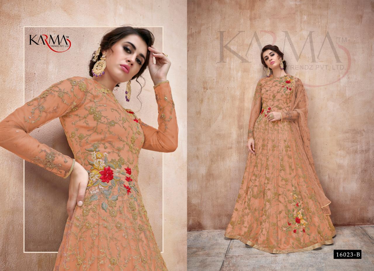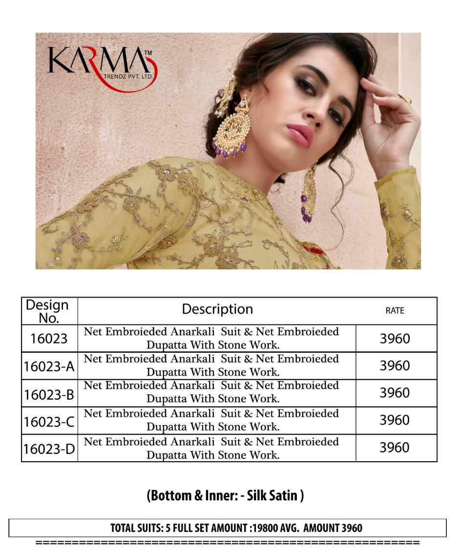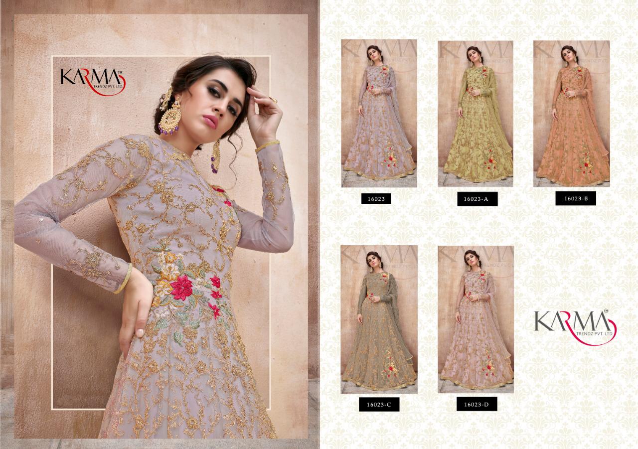 Buy Online Karma Series 16023 Colour Plus Anarkali Designer Party Wear Suits Set And Single Wholesale Supplier Surat 5 Pcs of Full Catalogue at Wholesale Price. Looking for Karma Series 16023 Colour Plus Anarkali Designer Party Wear Suits Set And Single Wholesale Supplier Surat Full Catalouge at Best Price? Buy Now Karma Series 16023 Colour Plus Anarkali Designer Party Wear Suits Set And Single Wholesale Supplier Surat at Wholesale Rate of Rs 19800 with Total 5 Pcs from authroized dealer and supplier of KARMA Brand. Cost of Each piece is just only Rs 3960 which is very low and affordable price to resale the product in your retail store ,This is Surat based Wholesale Supplier & Dealer of KARMA Brand. Click on Brand name to Know more about KARMA Brand's products.Call or Whatsapp on 9898838984 for booking or enquiry