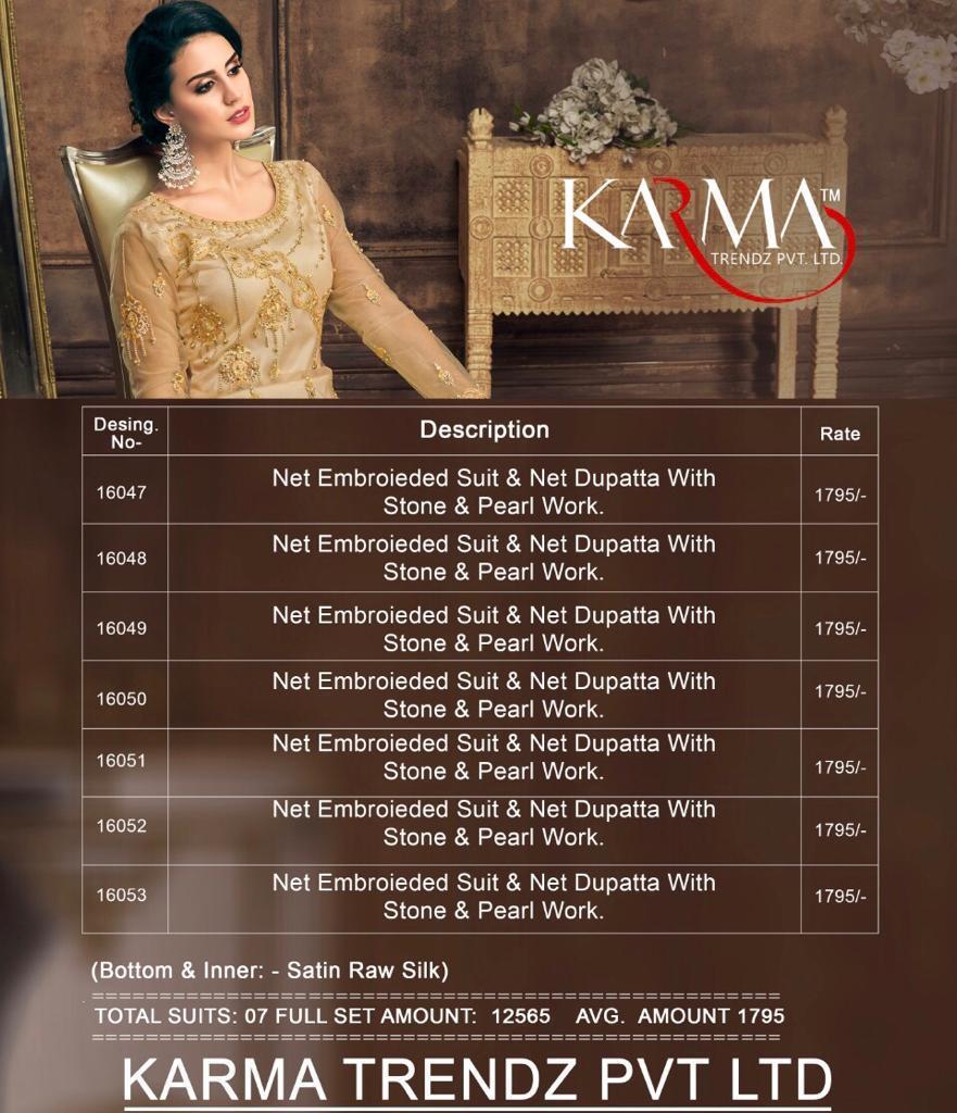 Buy Online Karma Series 16047 Designer Party Wear Suits Wholesale Supplier Gujarat 7 Pcs of Full Catalogue at Wholesale Price. Looking for Karma Series 16047 Designer Party Wear Suits Wholesale Supplier Gujarat Full Catalouge at Best Price? Buy Now Karma Series 16047 Designer Party Wear Suits Wholesale Supplier Gujarat at Wholesale Rate of Rs 12565 with Total 7 Pcs from authroized dealer and supplier of KARMA Brand. Cost of Each piece is just only Rs 1795 which is very low and affordable price to resale the product in your retail store ,This is Surat based Wholesale Supplier & Dealer of KARMA Brand. Click on Brand name to Know more about KARMA Brand's products.Call or Whatsapp on 9898838984 for booking or enquiry