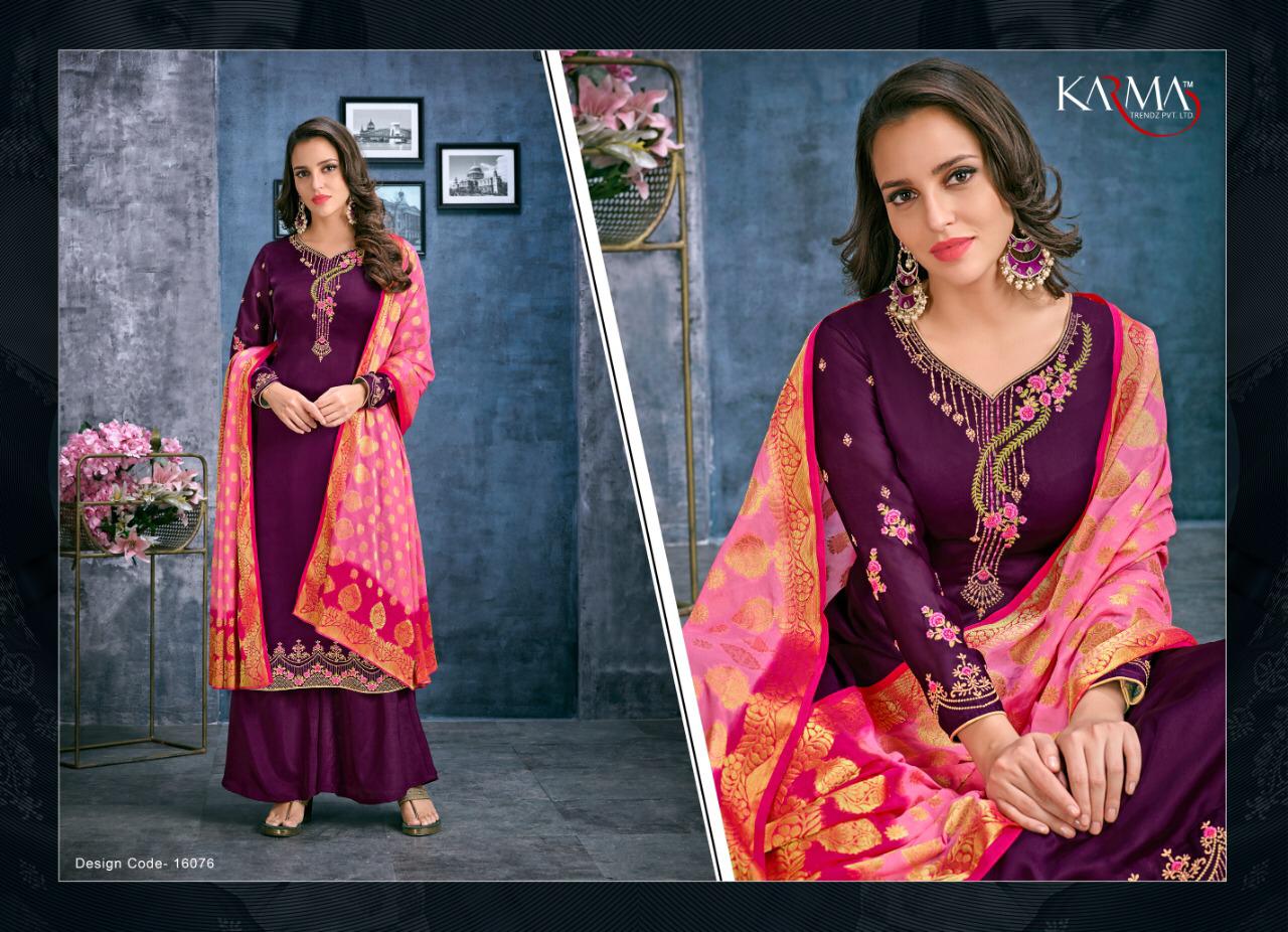 Karma Series 16074 To 16080 Designer Suits With Banarasi Shaded Duppta Wholesale Supplier Gujarat