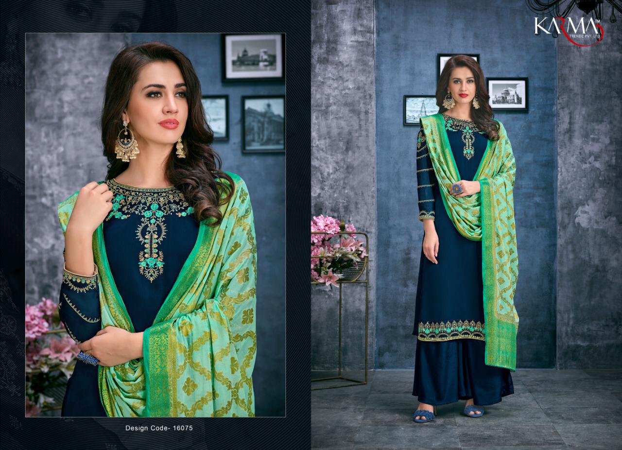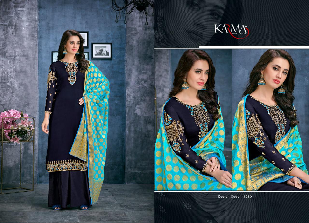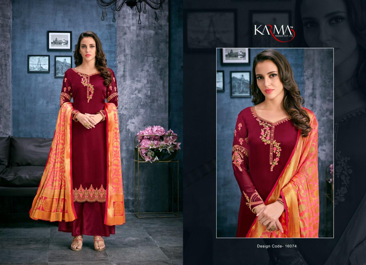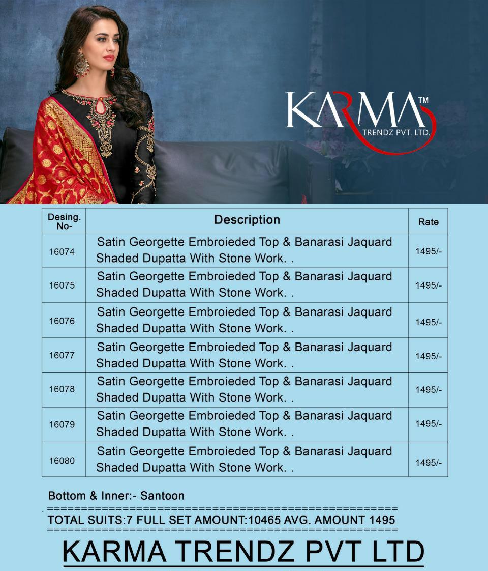 Buy Online Karma Series 16074 To 16080 Designer Suits With Banarasi Shaded Duppta Wholesale Supplier Gujarat 7 Pcs of Full Catalogue at Wholesale Price. Looking for Karma Series 16074 To 16080 Designer Suits With Banarasi Shaded Duppta Wholesale Supplier Gujarat Full Catalouge at Best Price? Buy Now Karma Series 16074 To 16080 Designer Suits With Banarasi Shaded Duppta Wholesale Supplier Gujarat at Wholesale Rate of Rs 10465 with Total 7 Pcs from authroized dealer and supplier of KARMA Brand. Cost of Each piece is just only Rs 1495 which is very low and affordable price to resale the product in your retail store ,This is Surat based Wholesale Supplier & Dealer of KARMA Brand. Click on Brand name to Know more about KARMA Brand's products.Call or Whatsapp on 9898838984 for booking or enquiry