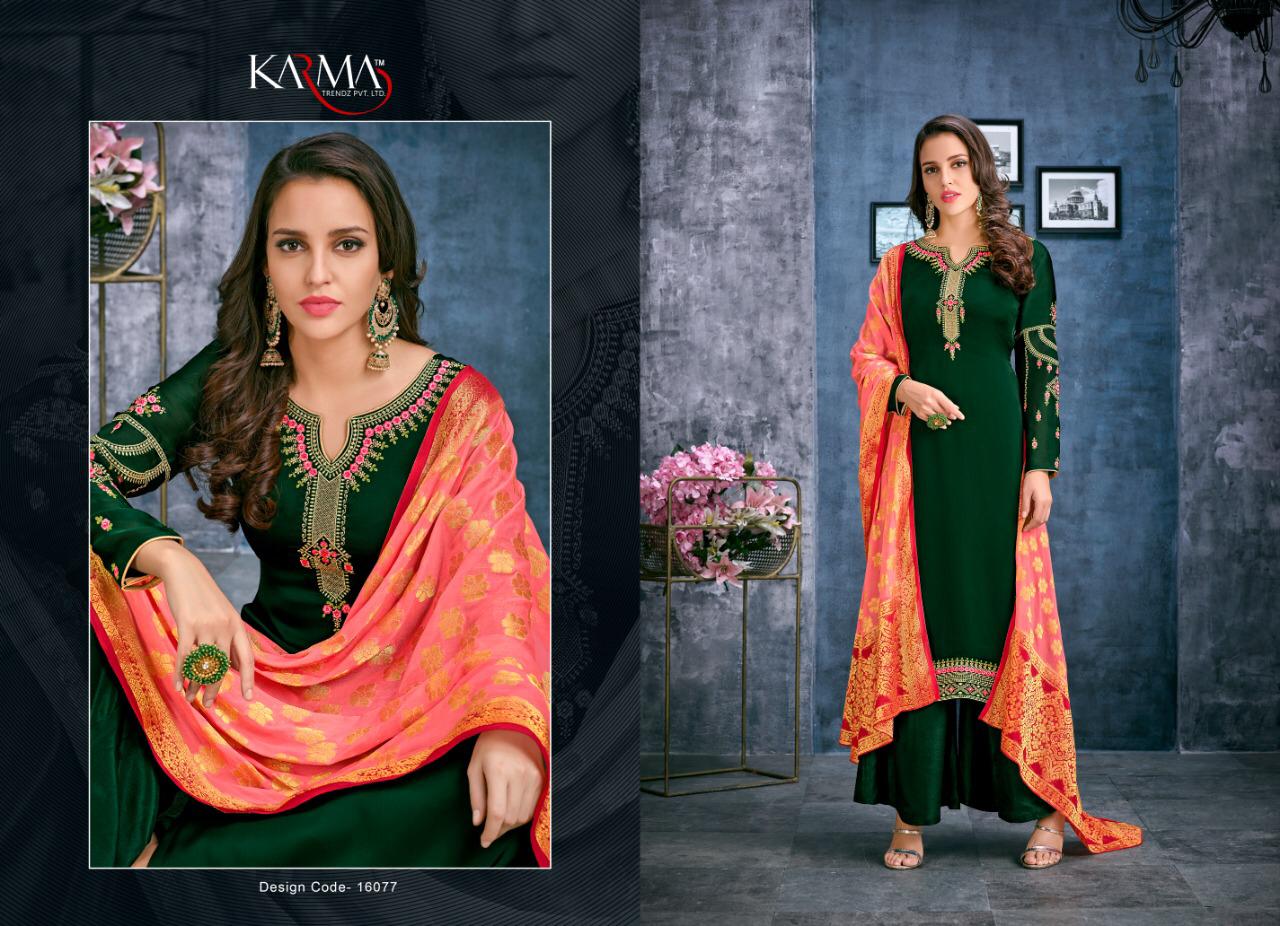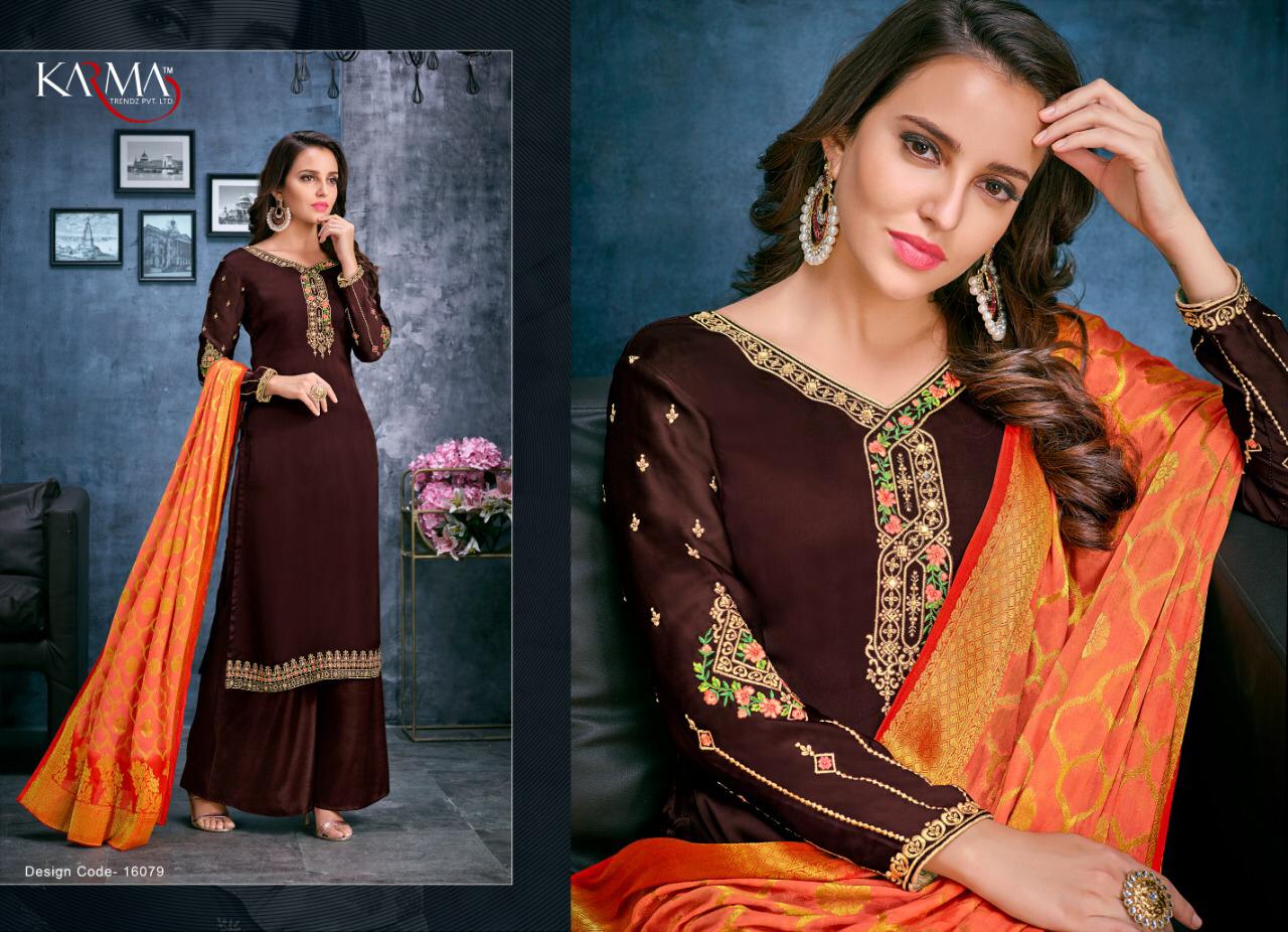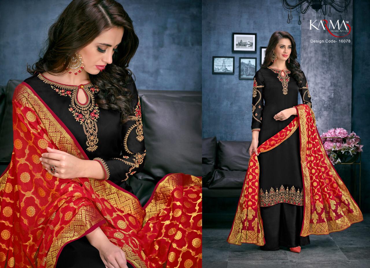 Buy Online Karma Series 16074 To 16080 Designer Suits With Banarasi Shaded Duppta Wholesale Supplier Gujarat 7 Pcs of Full Catalogue at Wholesale Price. Looking for Karma Series 16074 To 16080 Designer Suits With Banarasi Shaded Duppta Wholesale Supplier Gujarat Full Catalouge at Best Price? Buy Now Karma Series 16074 To 16080 Designer Suits With Banarasi Shaded Duppta Wholesale Supplier Gujarat at Wholesale Rate of Rs 10465 with Total 7 Pcs from authroized dealer and supplier of KARMA Brand. Cost of Each piece is just only Rs 1495 which is very low and affordable price to resale the product in your retail store ,This is Surat based Wholesale Supplier & Dealer of KARMA Brand. Click on Brand name to Know more about KARMA Brand's products.Call or Whatsapp on 9898838984 for booking or enquiry