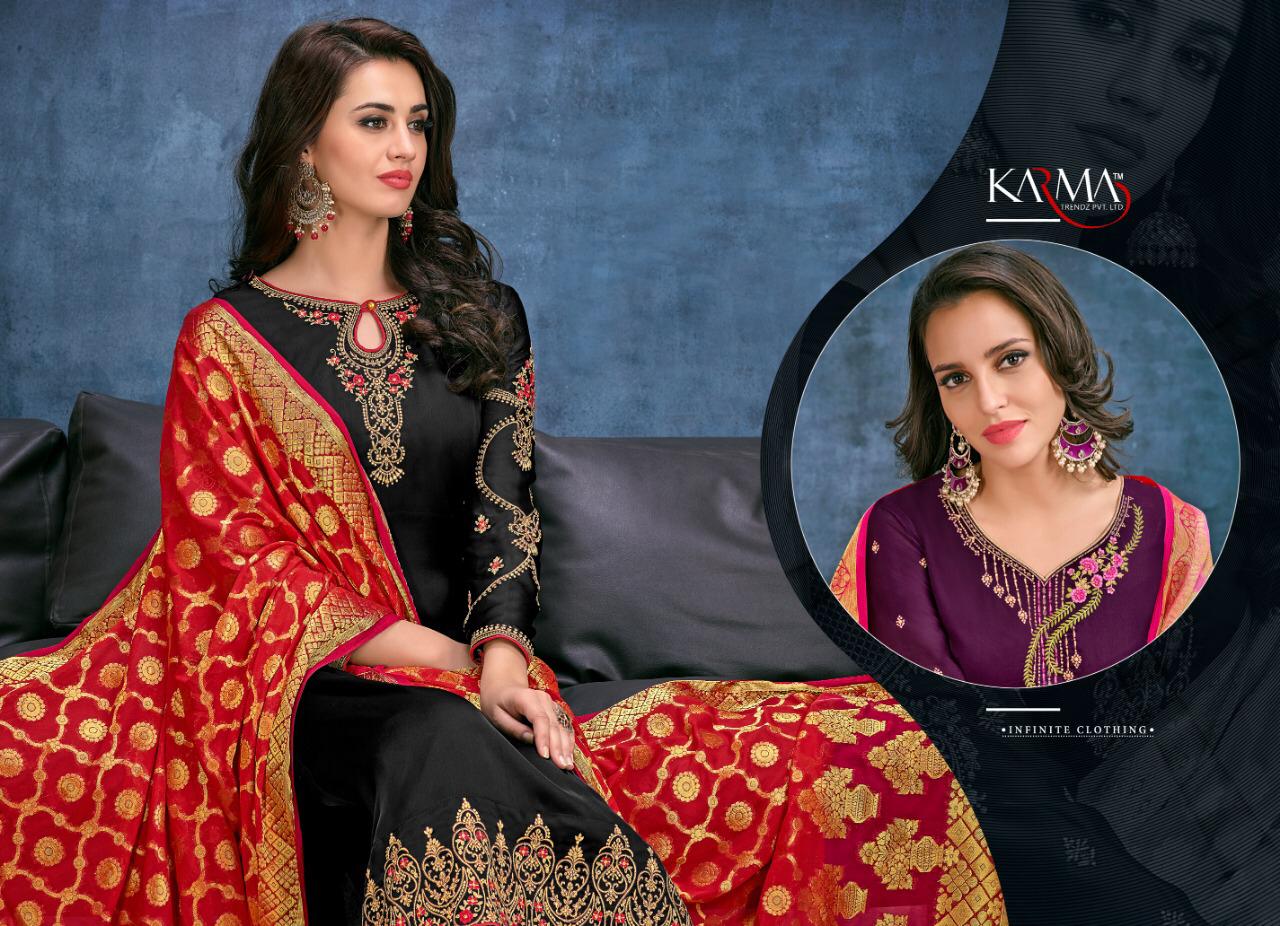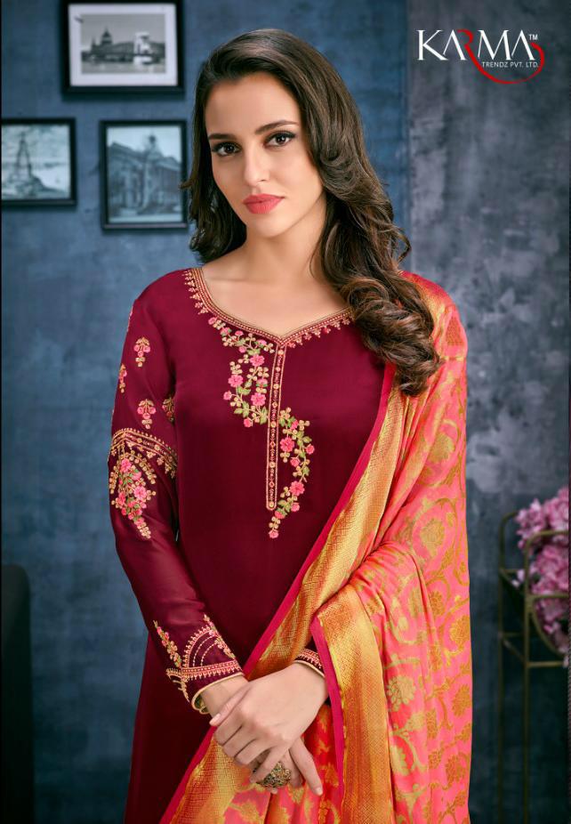 *"Karma"*_ BRAND CREATED BY YOU..... *Â?FANTASTIC SARTIN GEORGET EMBROIEDED TOP WITH BANARASI SHADED DUPPTA COLLECTION"* It is a Brand Synonymous with Sophistication and Style it is for the Women of today,who prefers to make a Statement whenever she step out. So that's the time we launched our most demanded dupatta concept Designer collection of 7 designs....... Fabric Details:- ? Top : - Sartin Georgette with Embroidery and additional hand diamond. Inner :- Santon Bottam -Santon ??Dup. : *Banarsi Shaded Print* Have a look to this awesome catalogue & book your orders...and thanks for ur support hope u always with us. Always with you...... Team:- *Karma* |
