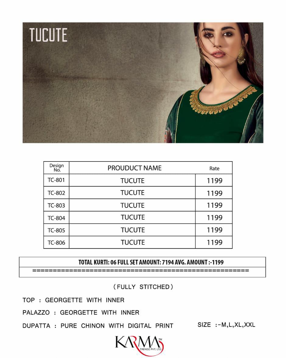 Buy Online Karma Tucute 801 Series Designer Ready To Wear Suits Wholesale Supplier Gujarat 6 Pcs of Full Catalogue at Wholesale Price. Looking for Karma Tucute 801 Series Designer Ready To Wear Suits Wholesale Supplier Gujarat Full Catalouge at Best Price? Buy Now Karma Tucute 801 Series Designer Ready To Wear Suits Wholesale Supplier Gujarat at Wholesale Rate of Rs 7194 with Total 6 Pcs from authroized dealer and supplier of KARMA Brand. Cost of Each piece is just only Rs 1199 which is very low and affordable price to resale the product in your retail store ,This is Surat based Wholesale Supplier & Dealer of KARMA Brand. Click on Brand name to Know more about KARMA Brand's products.Call or Whatsapp on 9898838984 for booking or enquiry