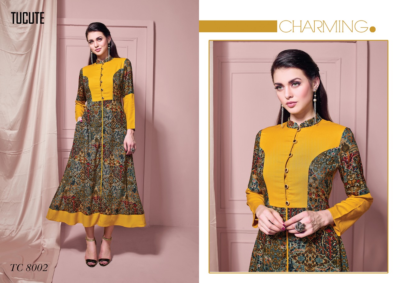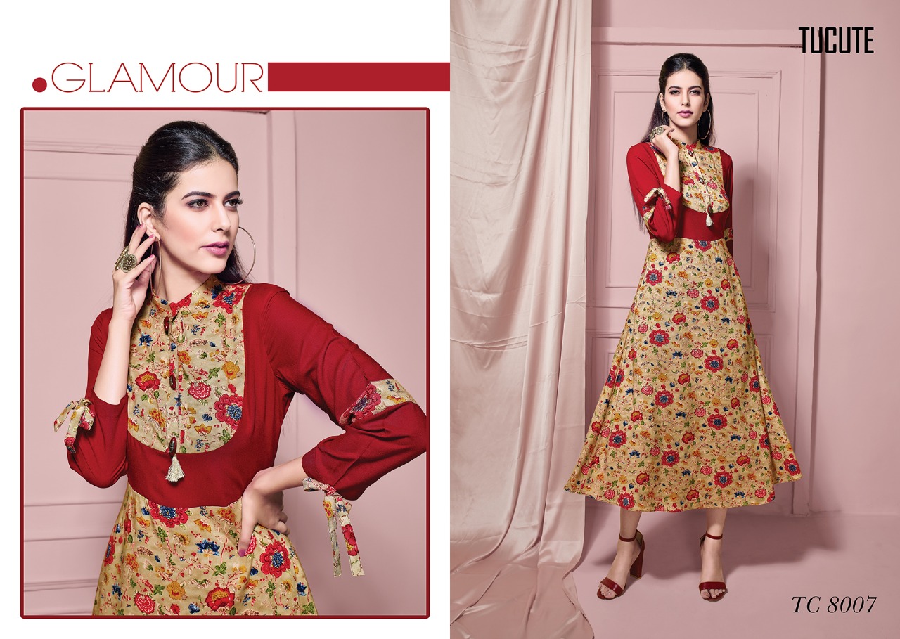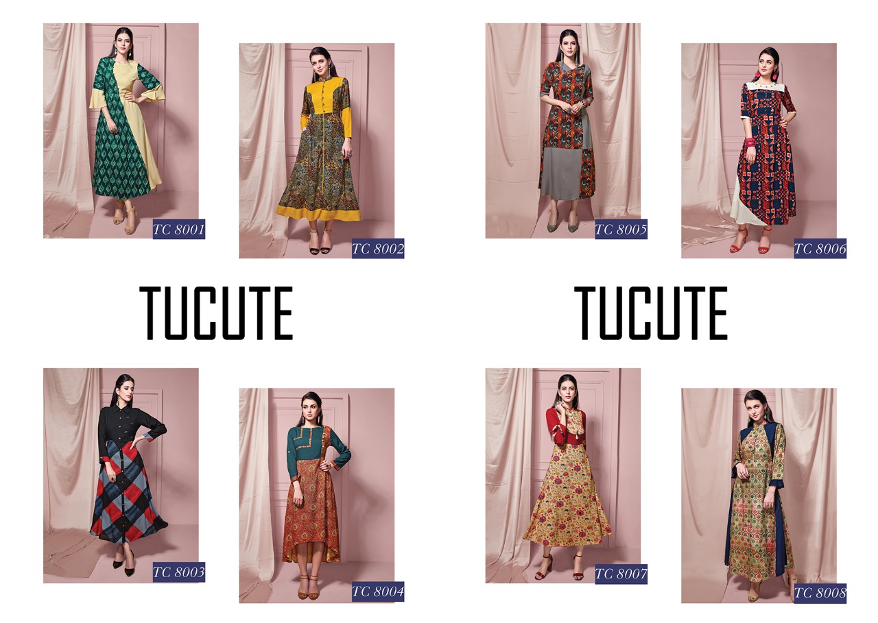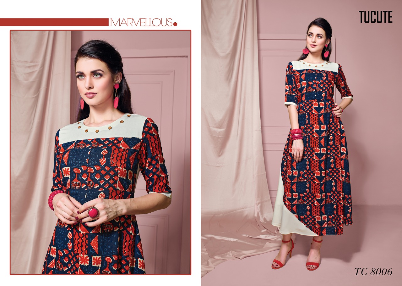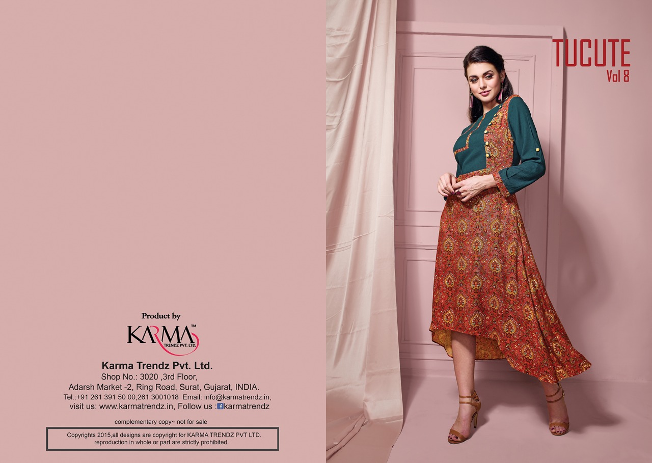 Buy Online Karma Tucute Vol 8 Reyon Printed Designer Kurtis Catalog Wholesalers Nd Trader Surat 8 Pcs of Full Catalogue at Wholesale Price. Looking for Karma Tucute Vol 8 Reyon Printed Designer Kurtis Catalog Wholesalers Nd Trader Surat Full Catalouge at Best Price? Buy Now Karma Tucute Vol 8 Reyon Printed Designer Kurtis Catalog Wholesalers Nd Trader Surat at Wholesale Rate of Rs 4320 with Total 8 Pcs from authroized dealer and supplier of KARMA Brand. Cost of Each piece is just only Rs 540 which is very low and affordable price to resale the product in your retail store ,This is Surat based Wholesale Supplier & Dealer of KARMA Brand. Click on Brand name to Know more about KARMA Brand's products.Call or Whatsapp on 9898838984 for booking or enquiry