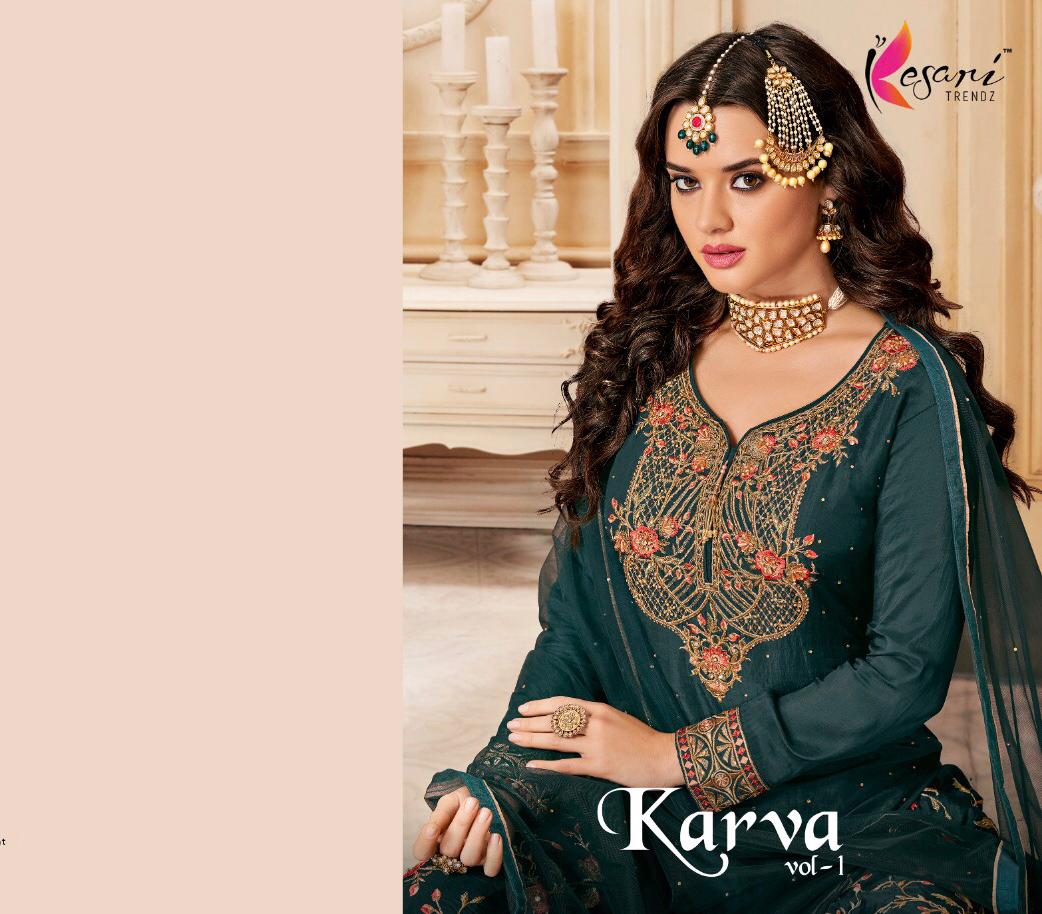 Buy Online Karva Vol 1 By Kesari Trendz Series 6001 Designer Party Wear Suits Wholesale Supplier Gujarat 5 Pcs of Full Catalogue at Wholesale Price. Looking for Karva Vol 1 By Kesari Trendz Series 6001 Designer Party Wear Suits Wholesale Supplier Gujarat Full Catalouge at Best Price? Buy Now Karva Vol 1 By Kesari Trendz Series 6001 Designer Party Wear Suits Wholesale Supplier Gujarat at Wholesale Rate of Rs 8975 with Total 5 Pcs from authroized dealer and supplier of KESARI TRENDZ Brand. Cost of Each piece is just only Rs 1795 which is very low and affordable price to resale the product in your retail store ,This is Surat based Wholesale Supplier & Dealer of KESARI TRENDZ Brand. Click on Brand name to Know more about KESARI TRENDZ Brand's products.Call or Whatsapp on 9898838984 for booking or enquiry