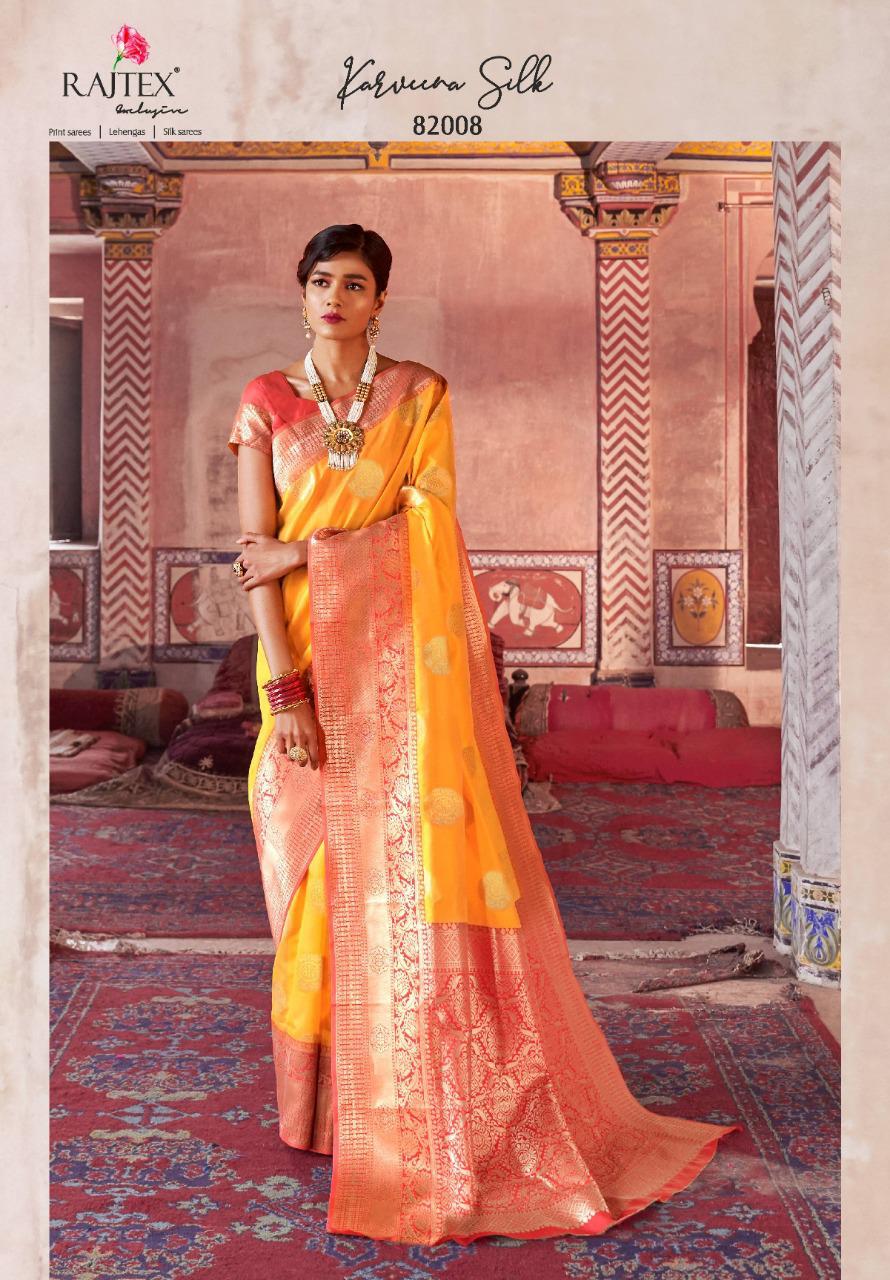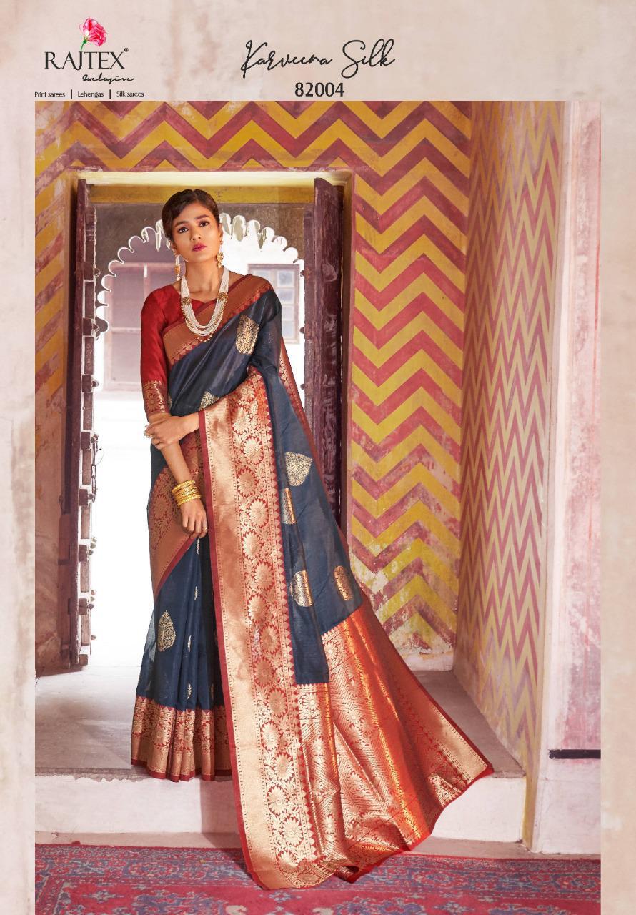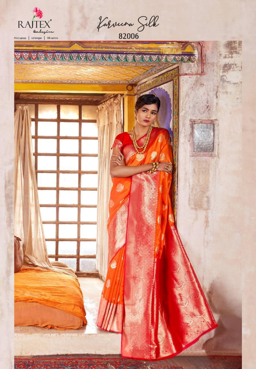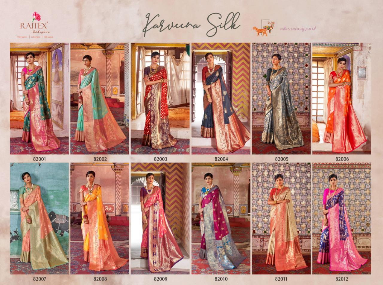 Buy Online Karveena Silk By Rajtex 82001 Series Fancy Traditional Party Wear Saree Collection Wholesaler Surat 12 Pcs of Full Catalogue at Wholesale Price. Looking for Karveena Silk By Rajtex 82001 Series Fancy Traditional Party Wear Saree Collection Wholesaler Surat Full Catalouge at Best Price? Buy Now Karveena Silk By Rajtex 82001 Series Fancy Traditional Party Wear Saree Collection Wholesaler Surat at Wholesale Rate of Rs 15120 with Total 12 Pcs from authroized dealer and supplier of RAJTEX Brand. Cost of Each piece is just only Rs 1260 which is very low and affordable price to resale the product in your retail store ,This is Surat based Wholesale Supplier & Dealer of RAJTEX Brand. Click on Brand name to Know more about RAJTEX Brand's products.Call or Whatsapp on 9898838984 for booking or enquiry