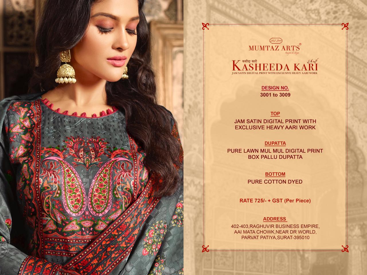 Buy Online Kasheeda Kari Nx By Mumtaz Arts Jam Satin Dress Materials Wholesale Supplier And Dealer Gujarat 9 Pcs of Full Catalogue at Wholesale Price. Looking for Kasheeda Kari Nx By Mumtaz Arts Jam Satin Dress Materials Wholesale Supplier And Dealer Gujarat Full Catalouge at Best Price? Buy Now Kasheeda Kari Nx By Mumtaz Arts Jam Satin Dress Materials Wholesale Supplier And Dealer Gujarat at Wholesale Rate of Rs 6525 with Total 9 Pcs from authroized dealer and supplier of MUMTAZ ARTS Brand. Cost of Each piece is just only Rs 725 which is very low and affordable price to resale the product in your retail store ,This is Surat based Wholesale Supplier & Dealer of MUMTAZ ARTS Brand. Click on Brand name to Know more about MUMTAZ ARTS Brand's products.Call or Whatsapp on 9898838984 for booking or enquiry