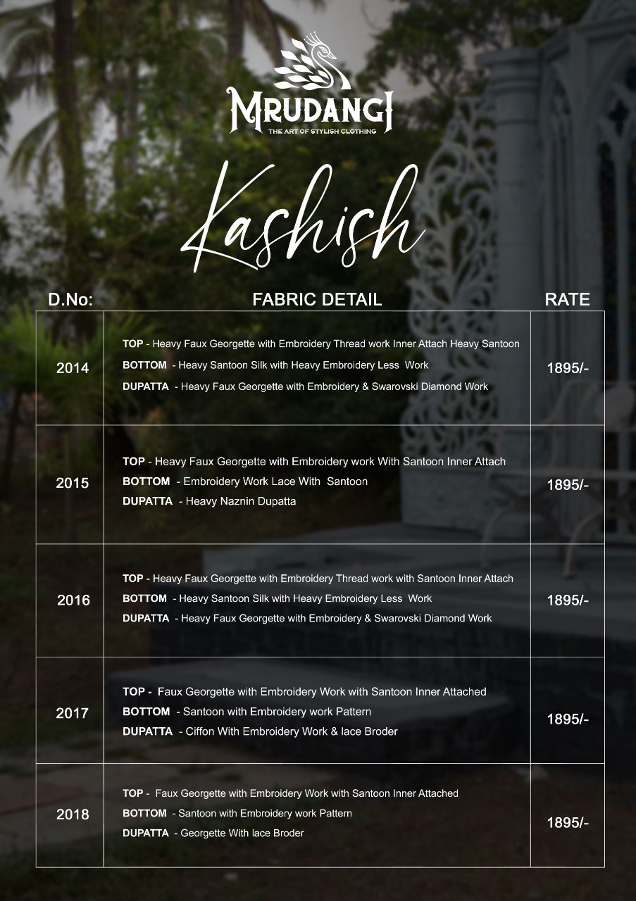 Buy Online Kashish By Mrudangi Suit Single And Set Stockiest And Supplier From Surat 5 Pcs of Full Catalogue at Wholesale Price. Looking for Kashish By Mrudangi Suit Single And Set Stockiest And Supplier From Surat Full Catalouge at Best Price? Buy Now Kashish By Mrudangi Suit Single And Set Stockiest And Supplier From Surat at Wholesale Rate of Rs 9475 with Total 5 Pcs from authroized dealer and supplier of Brand. Cost of Each piece is just only Rs 1895 which is very low and affordable price to resale the product in your retail store ,This is Surat based Wholesale Supplier & Dealer of Brand. Click on Brand name to Know more about Brand's products.Call or Whatsapp on 9898838984 for booking or enquiry