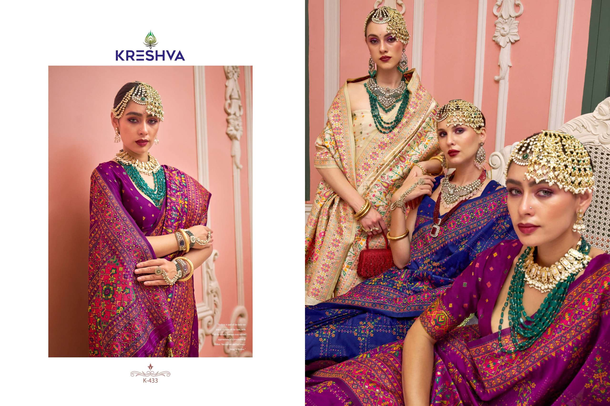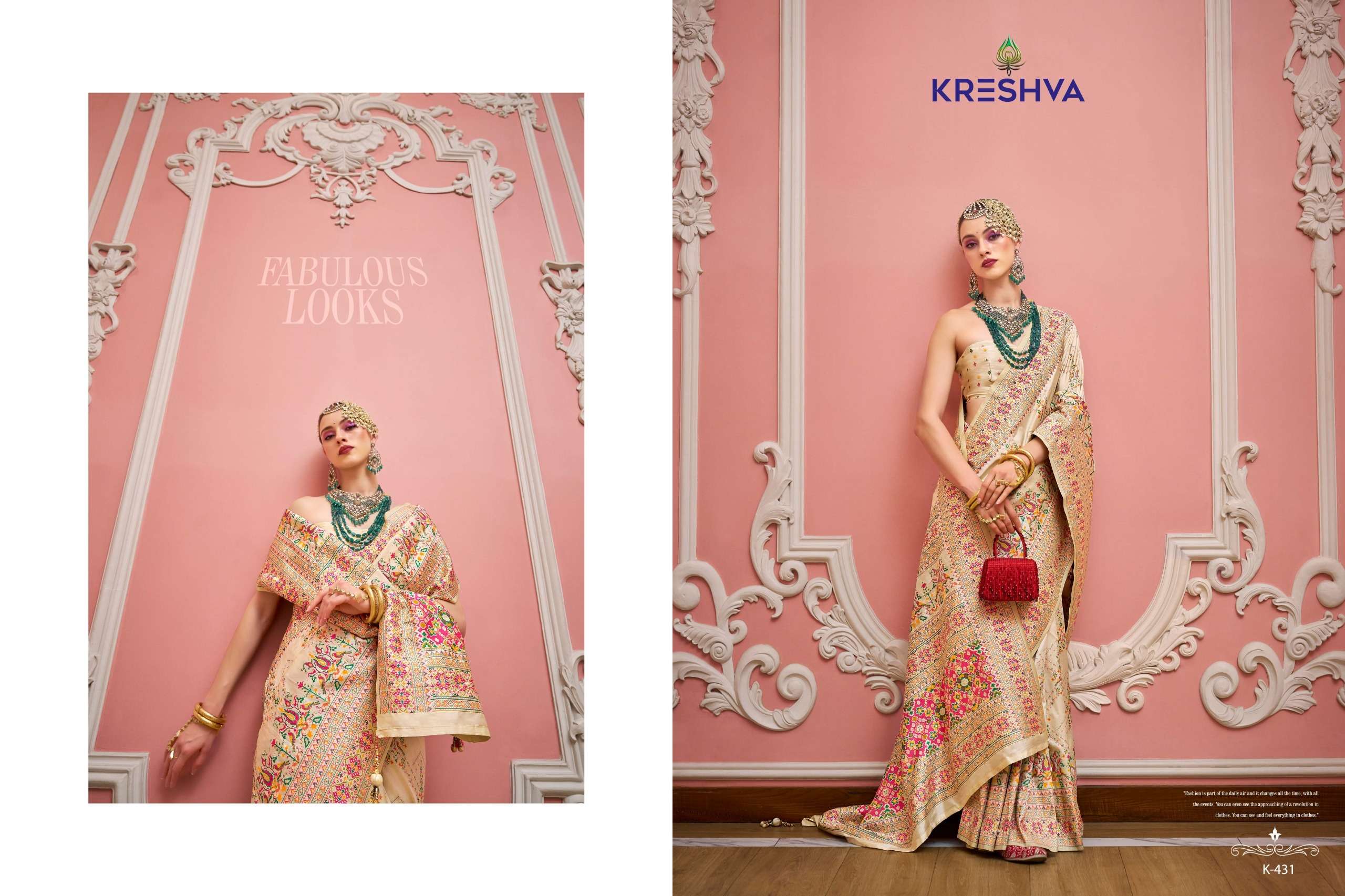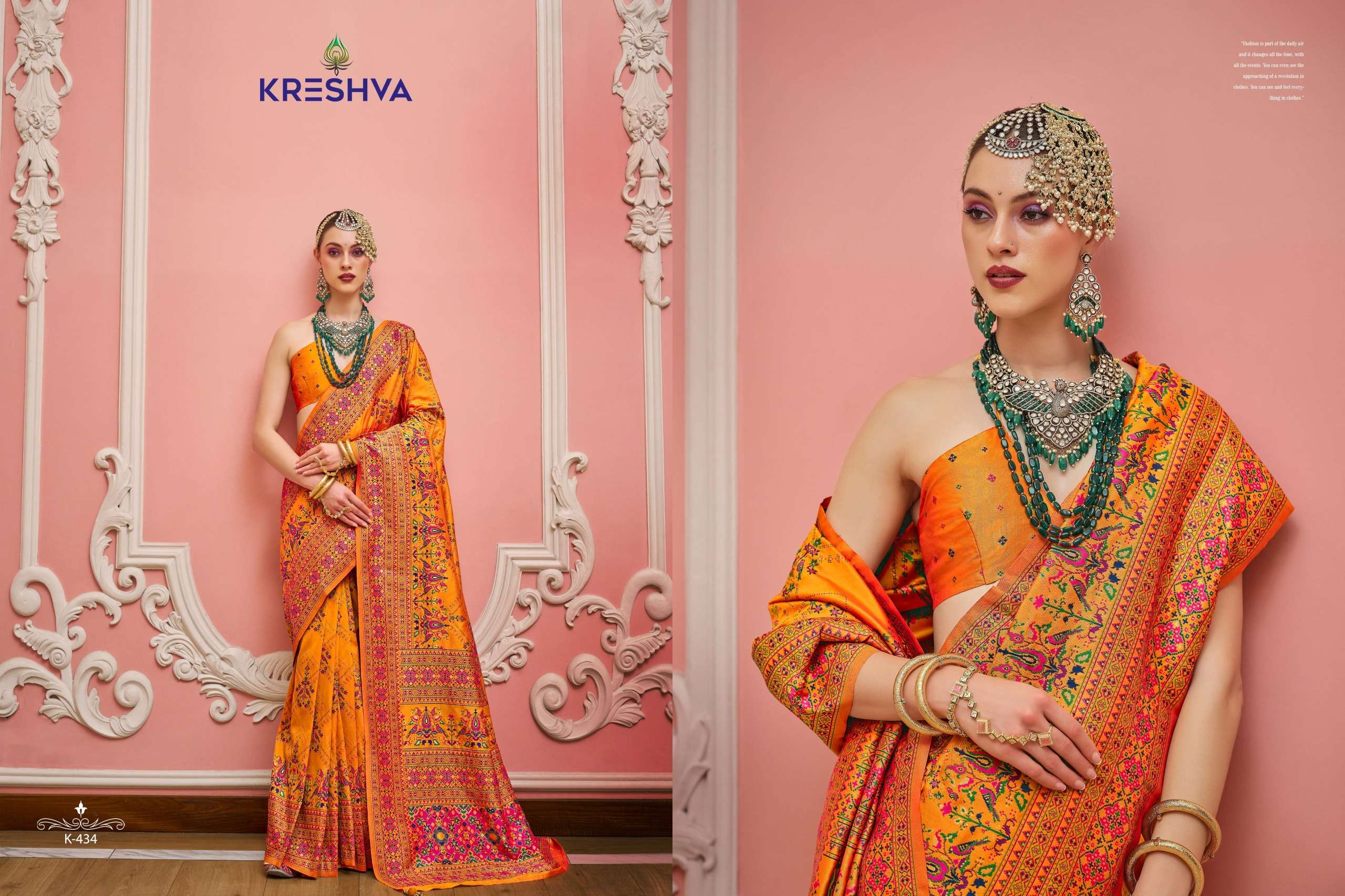 Buy Online Kashmir Vol 4 Series 429 To 436 by Kreshva saree Collection manufacturer surat 8 Pcs of Full Catalogue at Wholesale Price. Looking for Kashmir Vol 4 Series 429 To 436 by Kreshva saree Collection manufacturer surat Full Catalouge at Best Price? Buy Now Kashmir Vol 4 Series 429 To 436 by Kreshva saree Collection manufacturer surat at Wholesale Rate of Rs 15960 with Total 8 Pcs from authroized dealer and supplier of KRESHVA Brand. Cost of Each piece is just only Rs 1995 which is very low and affordable price to resale the product in your retail store ,This is Surat based Wholesale Supplier & Dealer of KRESHVA Brand. Click on Brand name to Know more about KRESHVA Brand's products.Call or Whatsapp on 9898838984 for booking or enquiry