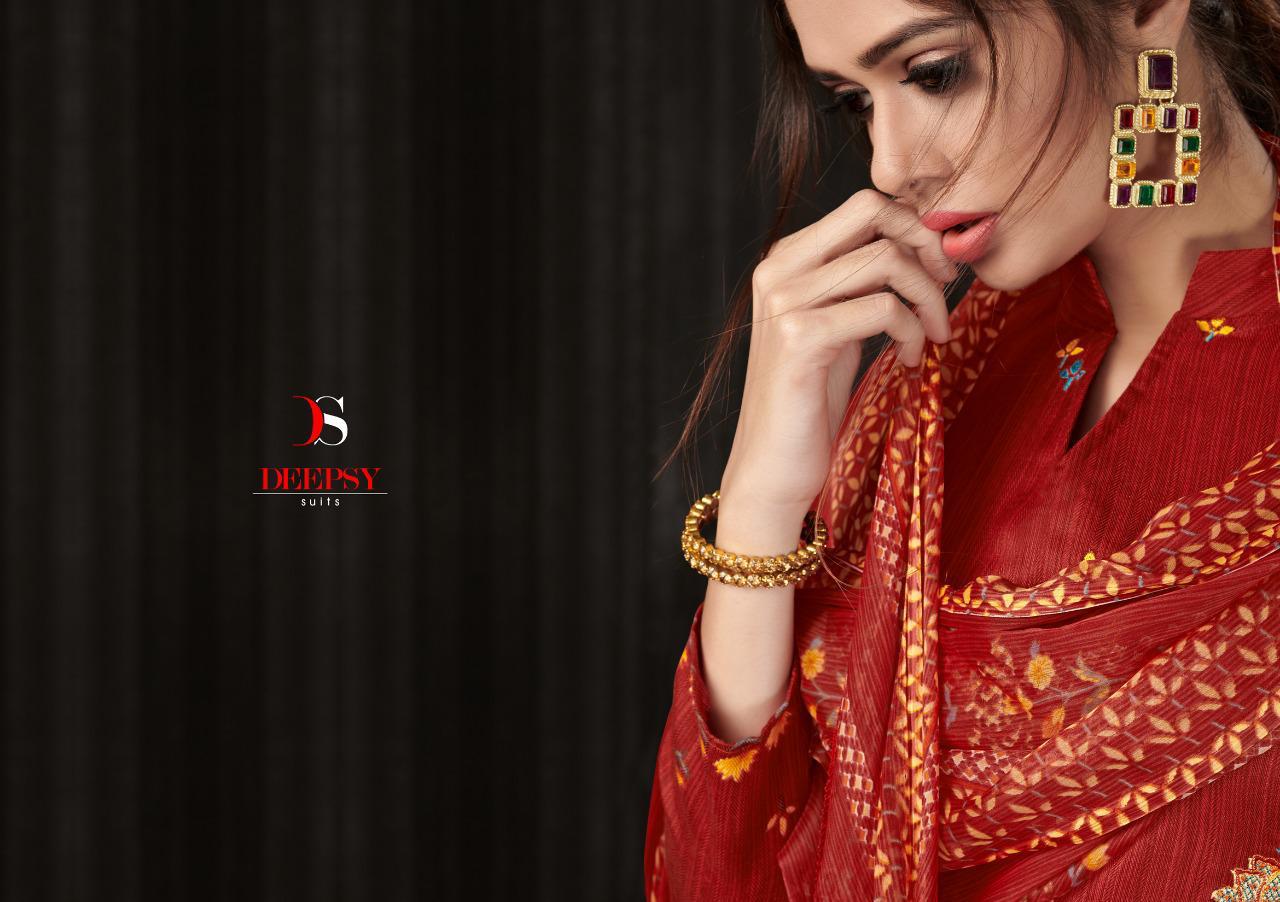 *Kashmira by DEEPSY SUITS* Top - Pure Cotton Satin Print with Self Embroidery Bot - Cotton Solid *2.70 Mtr* Dup - Chiffon Print *2.25Mtrs* With two side arco *Rate - 575+Gst * Delivery: Monday *_Splendid Quality With Digitally Printed Fabric_* * Special pouch packing* Ready to ship |