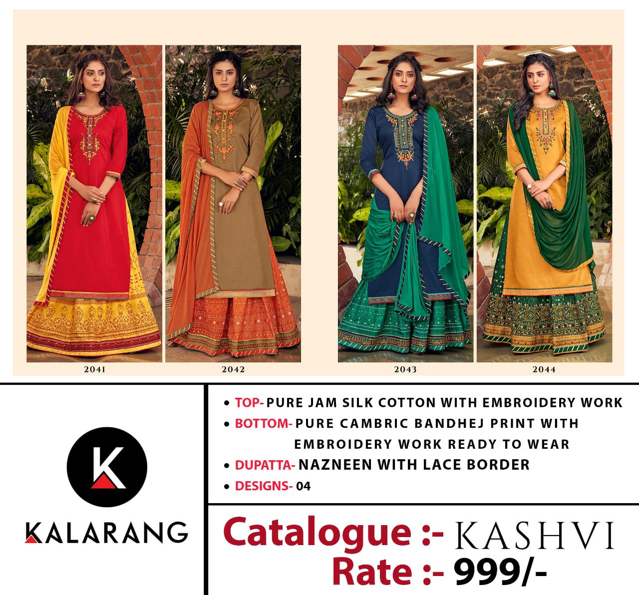 Buy Online Kashvi By Kalarang Manufacturer Traders Surat 4 Pcs of Full Catalogue at Wholesale Price. Looking for Kashvi By Kalarang Manufacturer Traders Surat Full Catalouge at Best Price? Buy Now Kashvi By Kalarang Manufacturer Traders Surat at Wholesale Rate of Rs 3996 with Total 4 Pcs from authroized dealer and supplier of KALARANG Brand. Cost of Each piece is just only Rs 999 which is very low and affordable price to resale the product in your retail store ,This is Surat based Wholesale Supplier & Dealer of KALARANG Brand. Click on Brand name to Know more about KALARANG Brand's products.Call or Whatsapp on 9898838984 for booking or enquiry