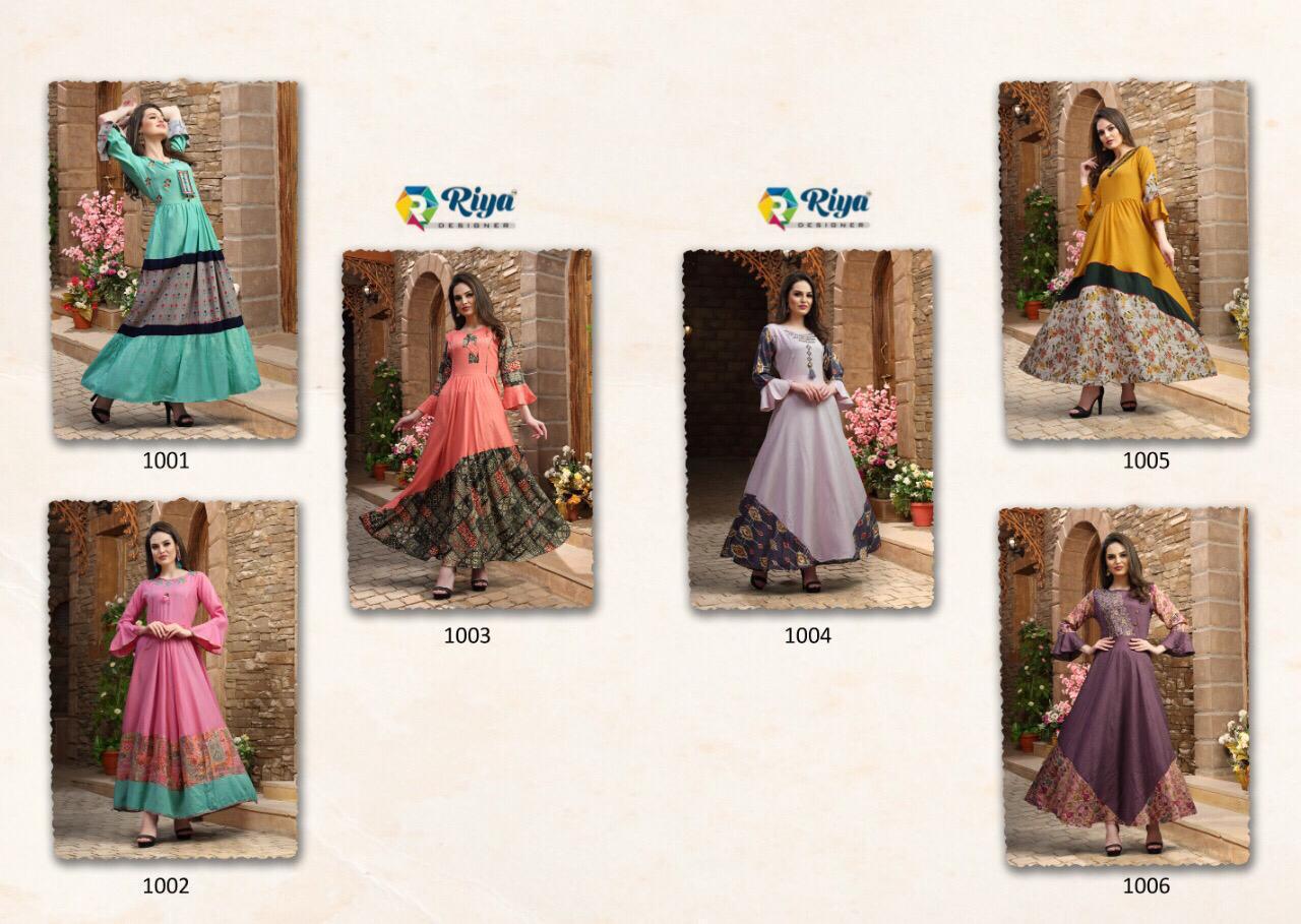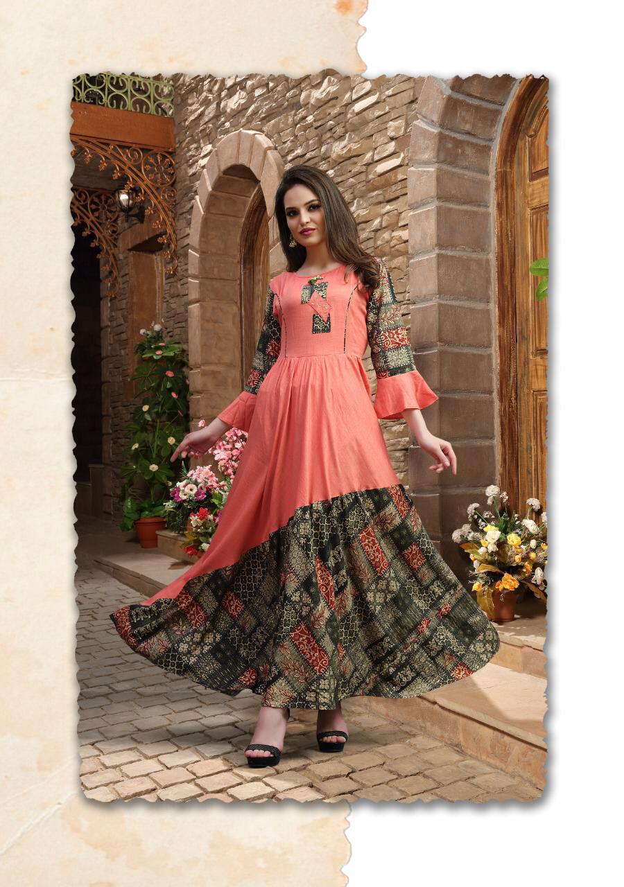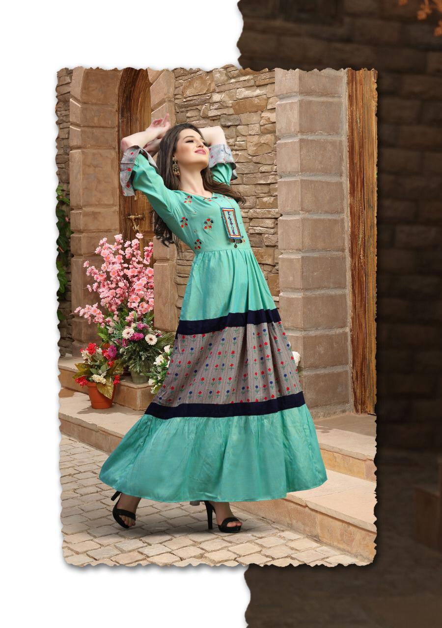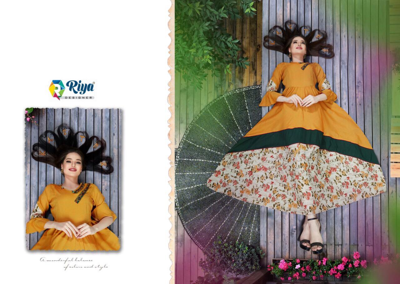 *Riya Designer* Â? is proud to launch its latest **Festive like* A collection of *Gown Kurtis* enriched with *Exquisite Handwork* paired with *Two Tone Fabric* ? Catalog: *Kastur* ? Kurti Fabric: *Two tone Namo with Reyon Print With Foil With Hand work And Assosrics* ?Pcs: *6* ? Sizes: *L, XL, XXL* ? Price: *799* per Pcs Set To Set. GST 5 Percent Extra Delivery soon Booking Started *Limited Stock* *Book your Orders Soon* |
