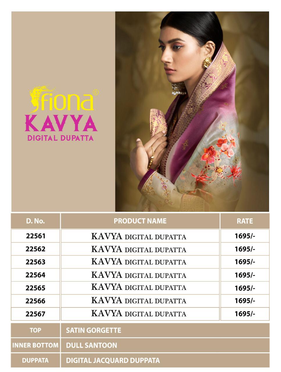 Buy Online Kavya By Fiona Series 22561 To 22567 Designer Party Wear Suits Wholesale Supplier Nd Dealer Gujarat 7 Pcs of Full Catalogue at Wholesale Price. Looking for Kavya By Fiona Series 22561 To 22567 Designer Party Wear Suits Wholesale Supplier Nd Dealer Gujarat Full Catalouge at Best Price? Buy Now Kavya By Fiona Series 22561 To 22567 Designer Party Wear Suits Wholesale Supplier Nd Dealer Gujarat at Wholesale Rate of Rs 11865 with Total 7 Pcs from authroized dealer and supplier of FIONA Brand. Cost of Each piece is just only Rs 1695 which is very low and affordable price to resale the product in your retail store ,This is Surat based Wholesale Supplier & Dealer of FIONA Brand. Click on Brand name to Know more about FIONA Brand's products.Call or Whatsapp on 9898838984 for booking or enquiry