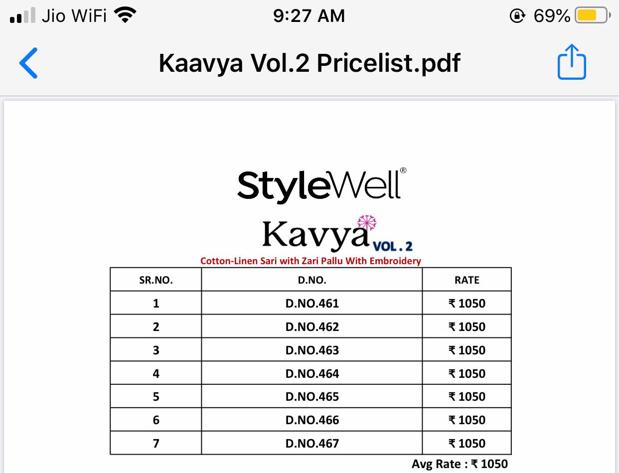 Buy Online Kavya By Stylewell Neelan Cotton Sarees Wholesale Supplier And Dealer Surat 7 Pcs of Full Catalogue at Wholesale Price. Looking for Kavya By Stylewell Neelan Cotton Sarees Wholesale Supplier And Dealer Surat Full Catalouge at Best Price? Buy Now Kavya By Stylewell Neelan Cotton Sarees Wholesale Supplier And Dealer Surat at Wholesale Rate of Rs 7350 with Total 7 Pcs from authroized dealer and supplier of STYLE WELL Brand. Cost of Each piece is just only Rs 1050 which is very low and affordable price to resale the product in your retail store ,This is Surat based Wholesale Supplier & Dealer of STYLE WELL Brand. Click on Brand name to Know more about STYLE WELL Brand's products.Call or Whatsapp on 9898838984 for booking or enquiry