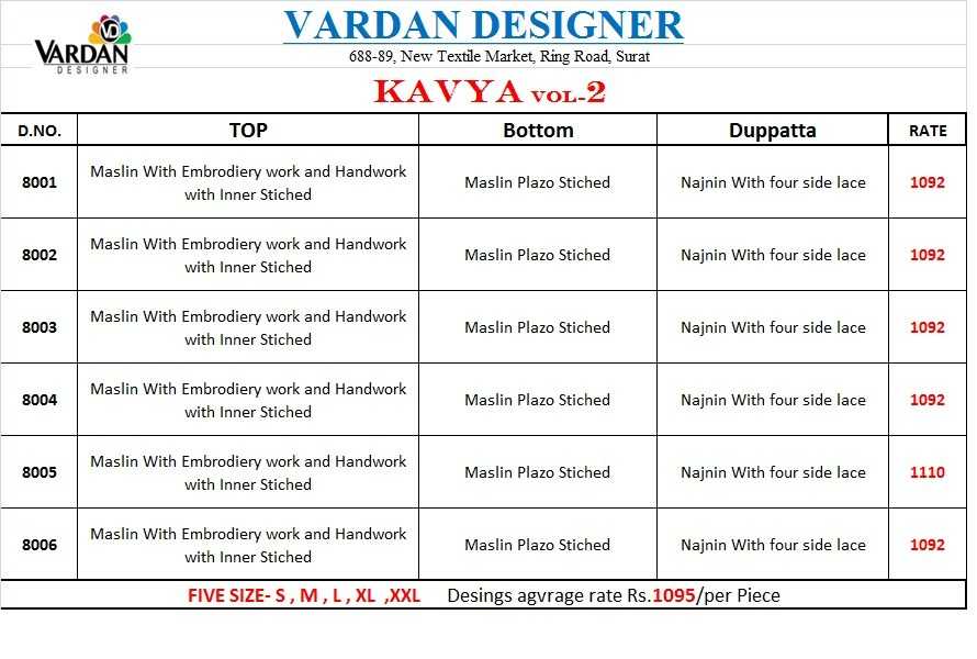 *Catalog* : VARDAN-Kavya vol 2 *Brand* : VARDAN *Fabric* : Muslin *Piece*: 6 *Size*: L, XL, XXL *Delivery Date*: 16-Oct-2018 *Price* : ?6570.0 *Average Price* : ?1095.0 |