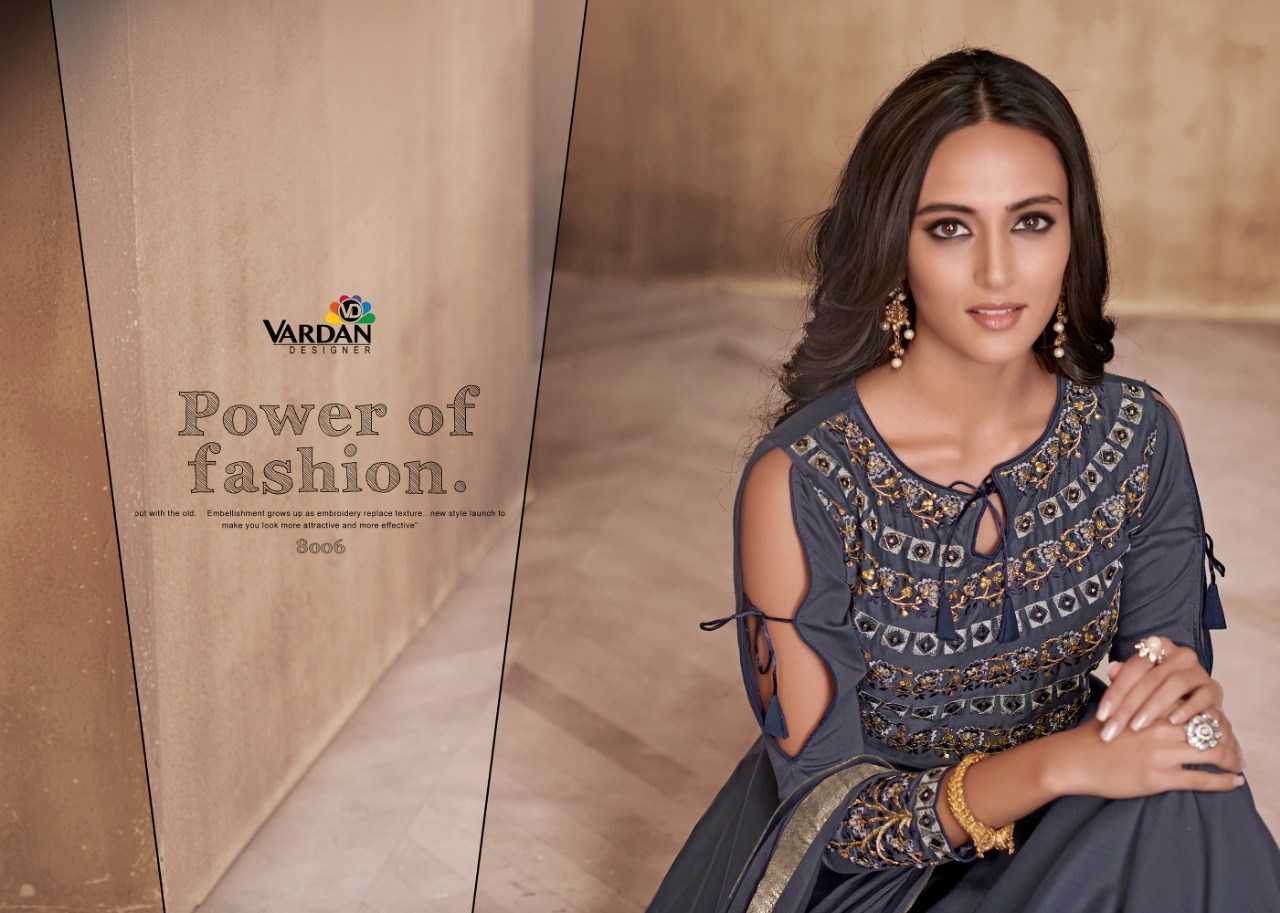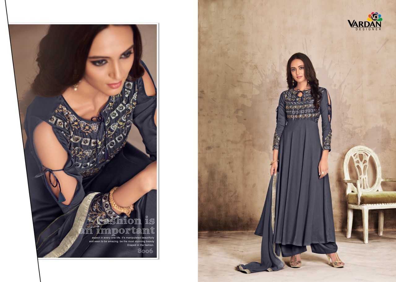 Buy Online Kavya Vol 2 By Vardan 8001 Series Fancy Muslin Silk Gown Suit Catlog Wholesale Dealer Surat 6 Pcs of Full Catalogue at Wholesale Price. Looking for Kavya Vol 2 By Vardan 8001 Series Fancy Muslin Silk Gown Suit Catlog Wholesale Dealer Surat Full Catalouge at Best Price? Buy Now Kavya Vol 2 By Vardan 8001 Series Fancy Muslin Silk Gown Suit Catlog Wholesale Dealer Surat at Wholesale Rate of Rs 6570 with Total 6 Pcs from authroized dealer and supplier of VARDAN DESIGNER Brand. Cost of Each piece is just only Rs 1095 which is very low and affordable price to resale the product in your retail store ,This is Surat based Wholesale Supplier & Dealer of VARDAN DESIGNER Brand. Click on Brand name to Know more about VARDAN DESIGNER Brand's products.Call or Whatsapp on 9898838984 for booking or enquiry