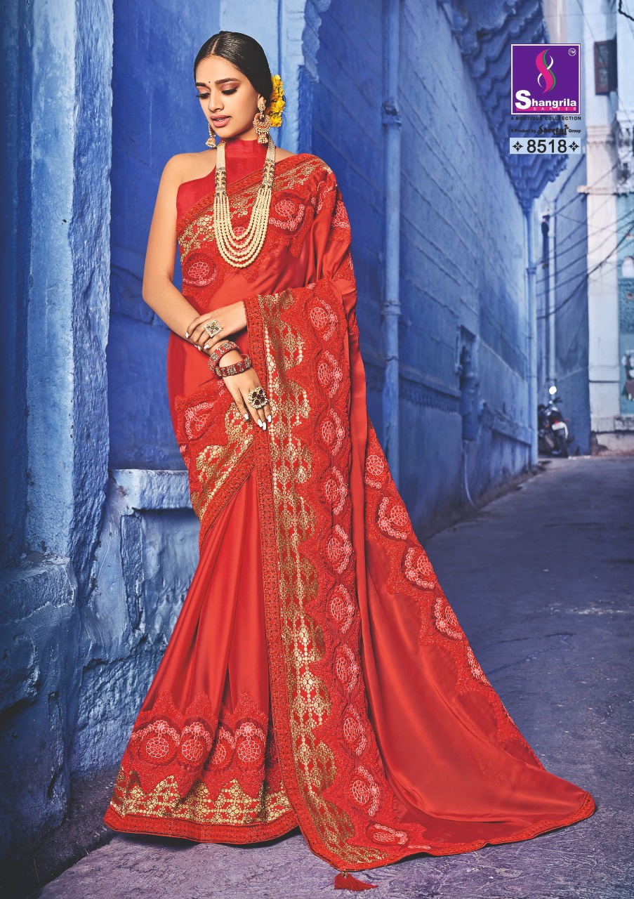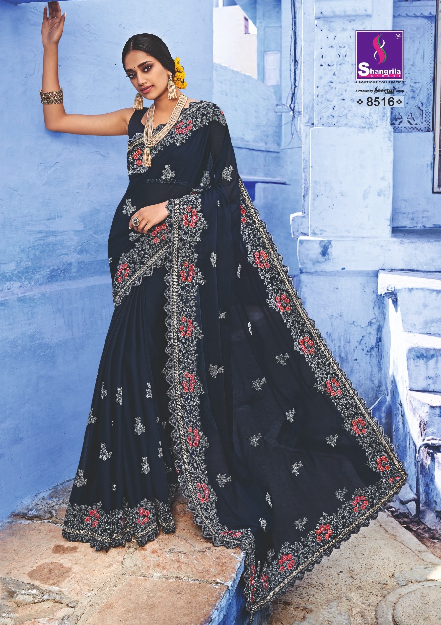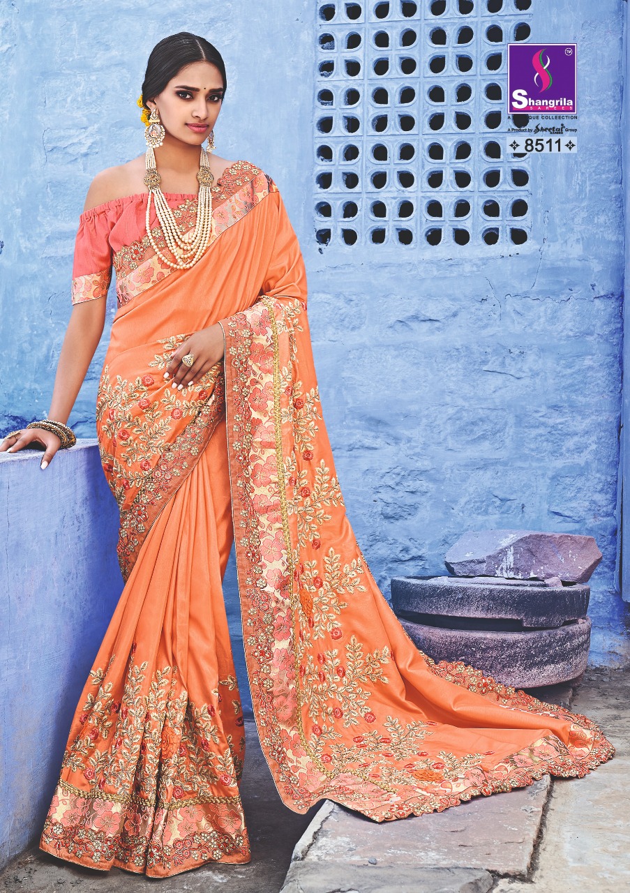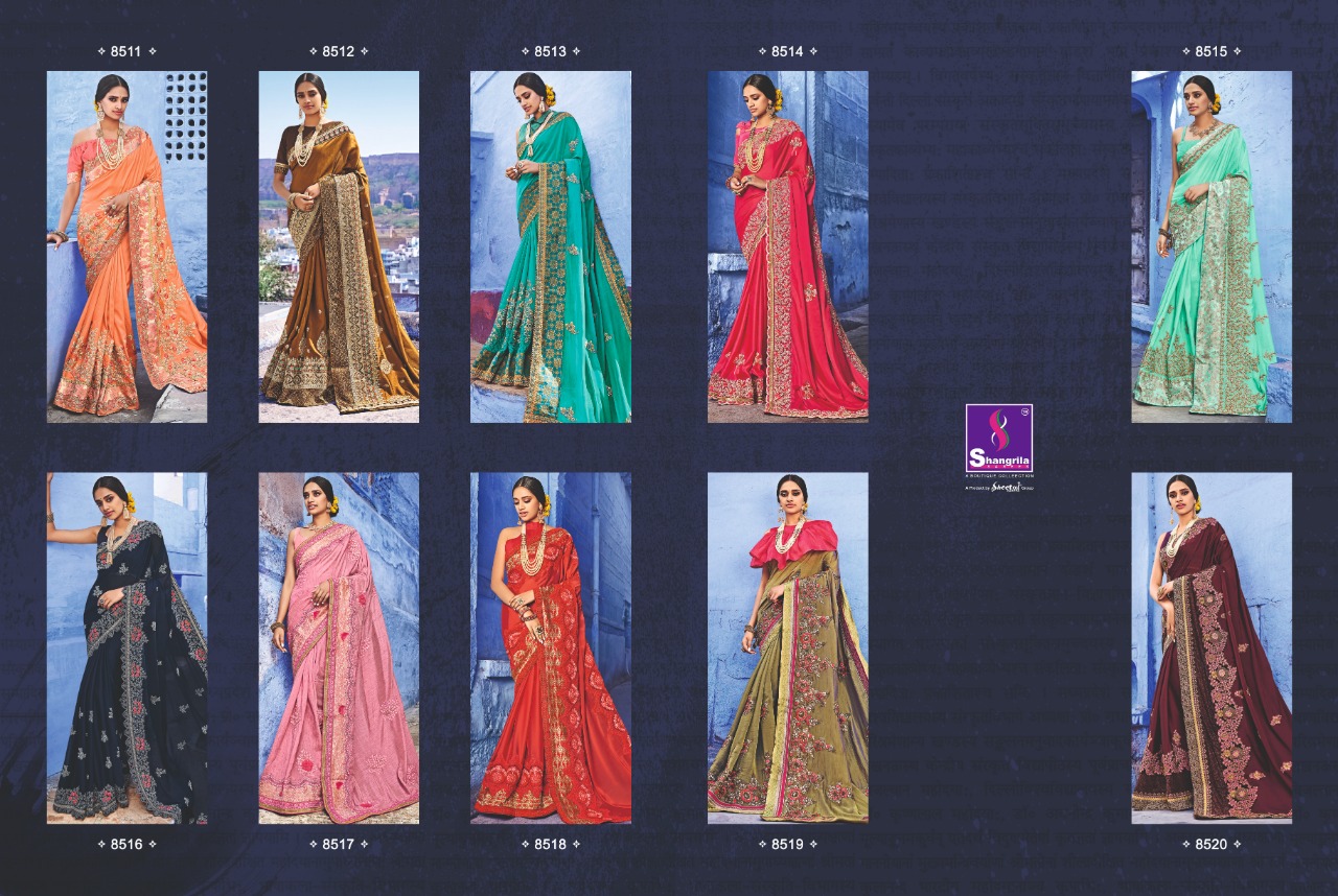 Buy Online Kavyanjali By Shangrila Series 8511 To 8520 Heavy Designer Work Party Wear Sarees Wholesale Supplier Gujarat 10 Pcs of Full Catalogue at Wholesale Price. Looking for Kavyanjali By Shangrila Series 8511 To 8520 Heavy Designer Work Party Wear Sarees Wholesale Supplier Gujarat Full Catalouge at Best Price? Buy Now Kavyanjali By Shangrila Series 8511 To 8520 Heavy Designer Work Party Wear Sarees Wholesale Supplier Gujarat at Wholesale Rate of Rs 12500 with Total 10 Pcs from authroized dealer and supplier of SHANGRILA Brand. Cost of Each piece is just only Rs 1250 which is very low and affordable price to resale the product in your retail store ,This is Surat based Wholesale Supplier & Dealer of SHANGRILA Brand. Click on Brand name to Know more about SHANGRILA Brand's products.Call or Whatsapp on 9898838984 for booking or enquiry