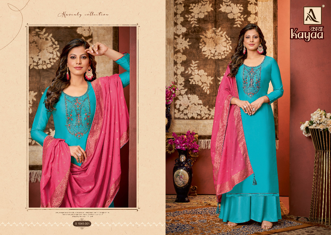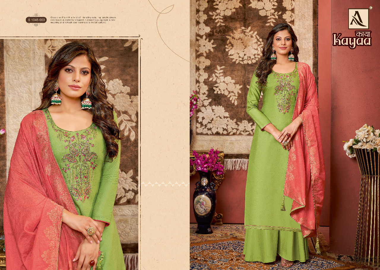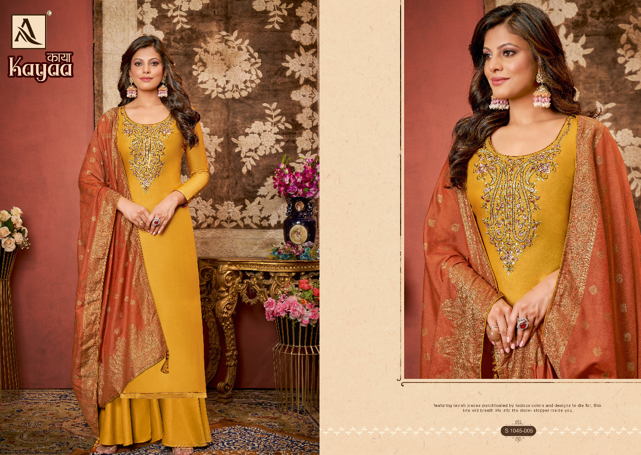 Buy Online Kayaa By Alok Suit Dyed With Fancy Embroidery Wholesaler Supplier From Surat 6 Pcs of Full Catalogue at Wholesale Price. Looking for Kayaa By Alok Suit Dyed With Fancy Embroidery Wholesaler Supplier From Surat Full Catalouge at Best Price? Buy Now Kayaa By Alok Suit Dyed With Fancy Embroidery Wholesaler Supplier From Surat at Wholesale Rate of Rs 5394 with Total 6 Pcs from authroized dealer and supplier of Brand. Cost of Each piece is just only Rs 899 which is very low and affordable price to resale the product in your retail store ,This is Surat based Wholesale Supplier & Dealer of Brand. Click on Brand name to Know more about Brand's products.Call or Whatsapp on 9898838984 for booking or enquiry