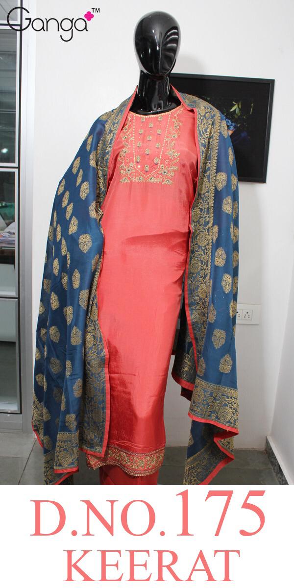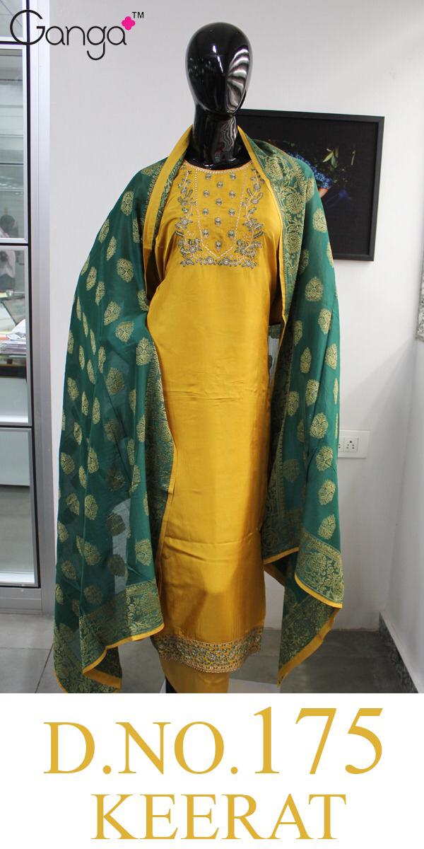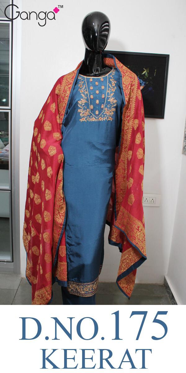 Buy Online Keerat 175 By Ganga Silk Embroidered Suits Wholesale Supplier Gujarat 4 Pcs of Full Catalogue at Wholesale Price. Looking for Keerat 175 By Ganga Silk Embroidered Suits Wholesale Supplier Gujarat Full Catalouge at Best Price? Buy Now Keerat 175 By Ganga Silk Embroidered Suits Wholesale Supplier Gujarat at Wholesale Rate of Rs 8320 with Total 4 Pcs from authroized dealer and supplier of GANGA Brand. Cost of Each piece is just only Rs 2080 which is very low and affordable price to resale the product in your retail store ,This is Surat based Wholesale Supplier & Dealer of GANGA Brand. Click on Brand name to Know more about GANGA Brand's products.Call or Whatsapp on 9898838984 for booking or enquiry