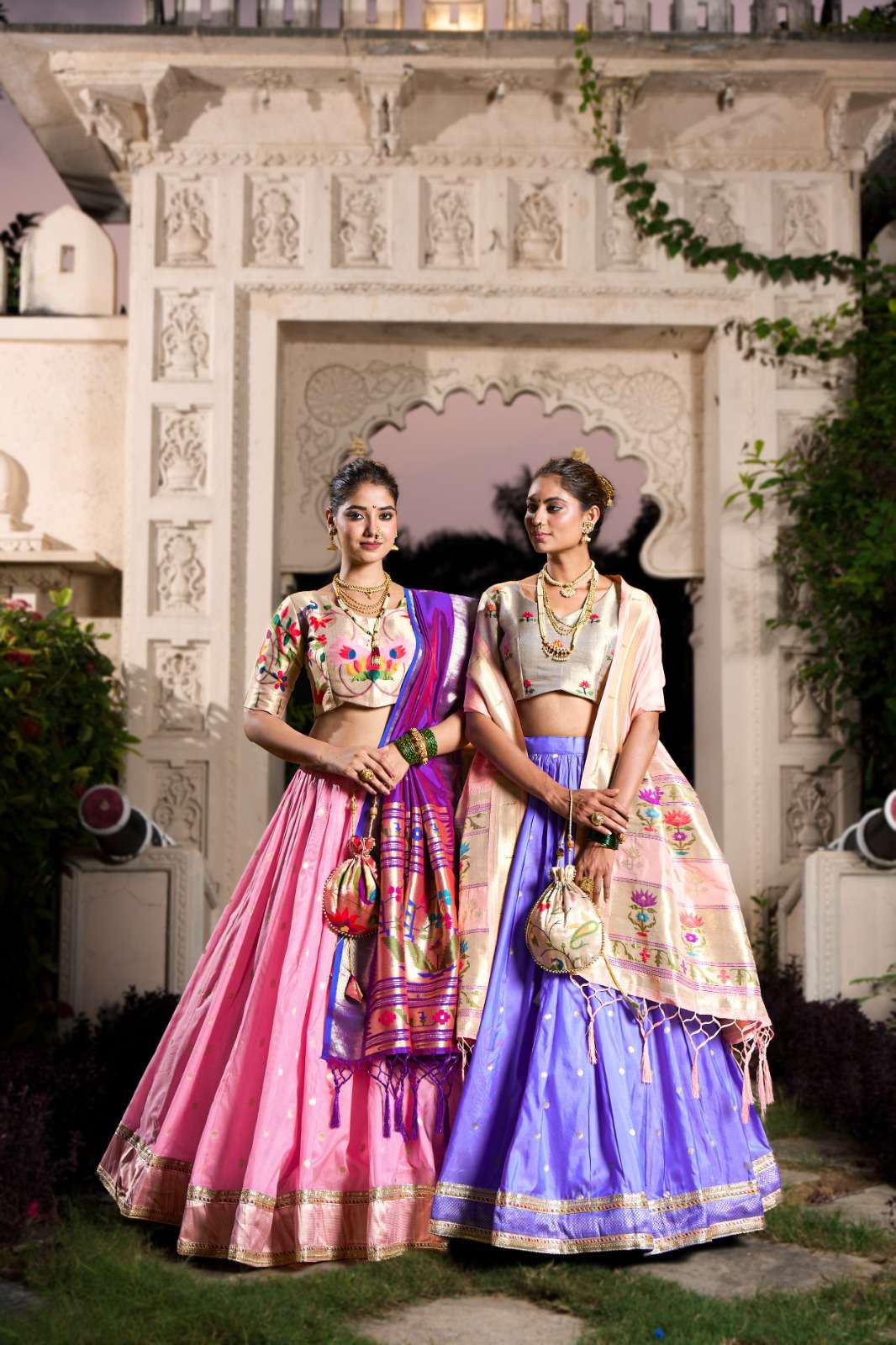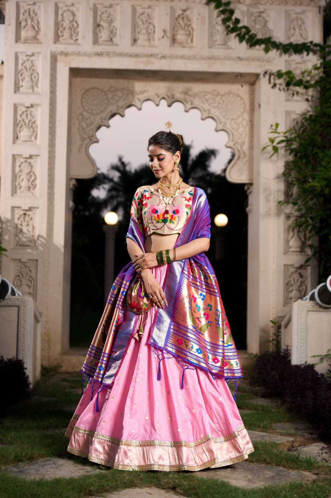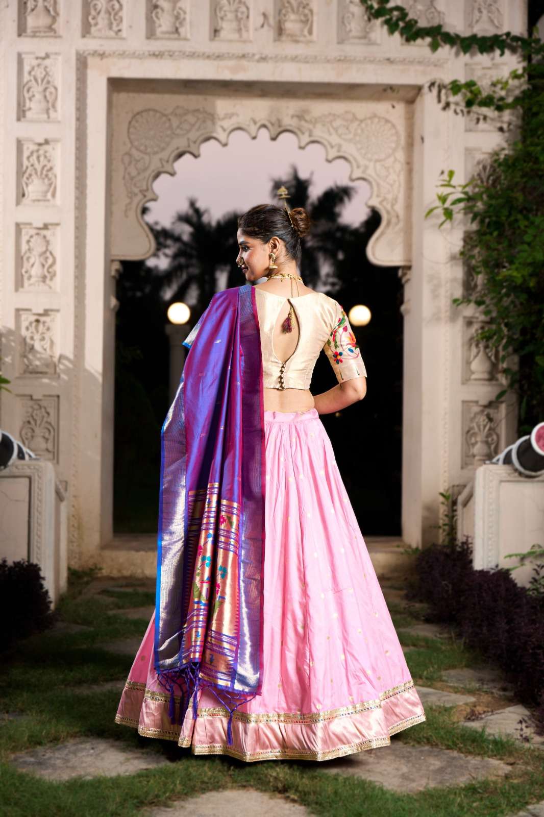 *Lehenga(Stitched)* Lehenga Fabric : Jacquard Silk (Paithani) Lehenga work : Weaving Zari Work With Lace Touch Up Lehenga Waist : SUPPORTED UP TO 42 Lehenga Closer : Drawstring with Handmade Tassels Stitching : Stitched With Canvas and Can Can Length : 41 Flair : 4 Meter Inner : Micro Cotton