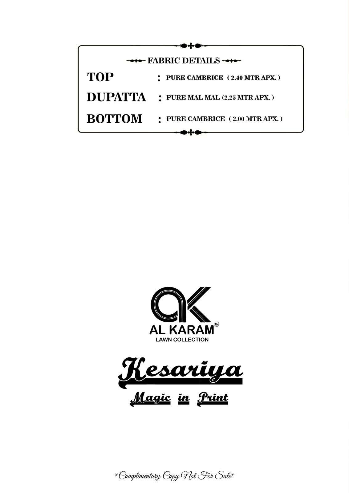 | Catalog | Kesariya Magic in Print VOL 15 by AL KARAM Pure Cambric suit collection manufacturer surat |